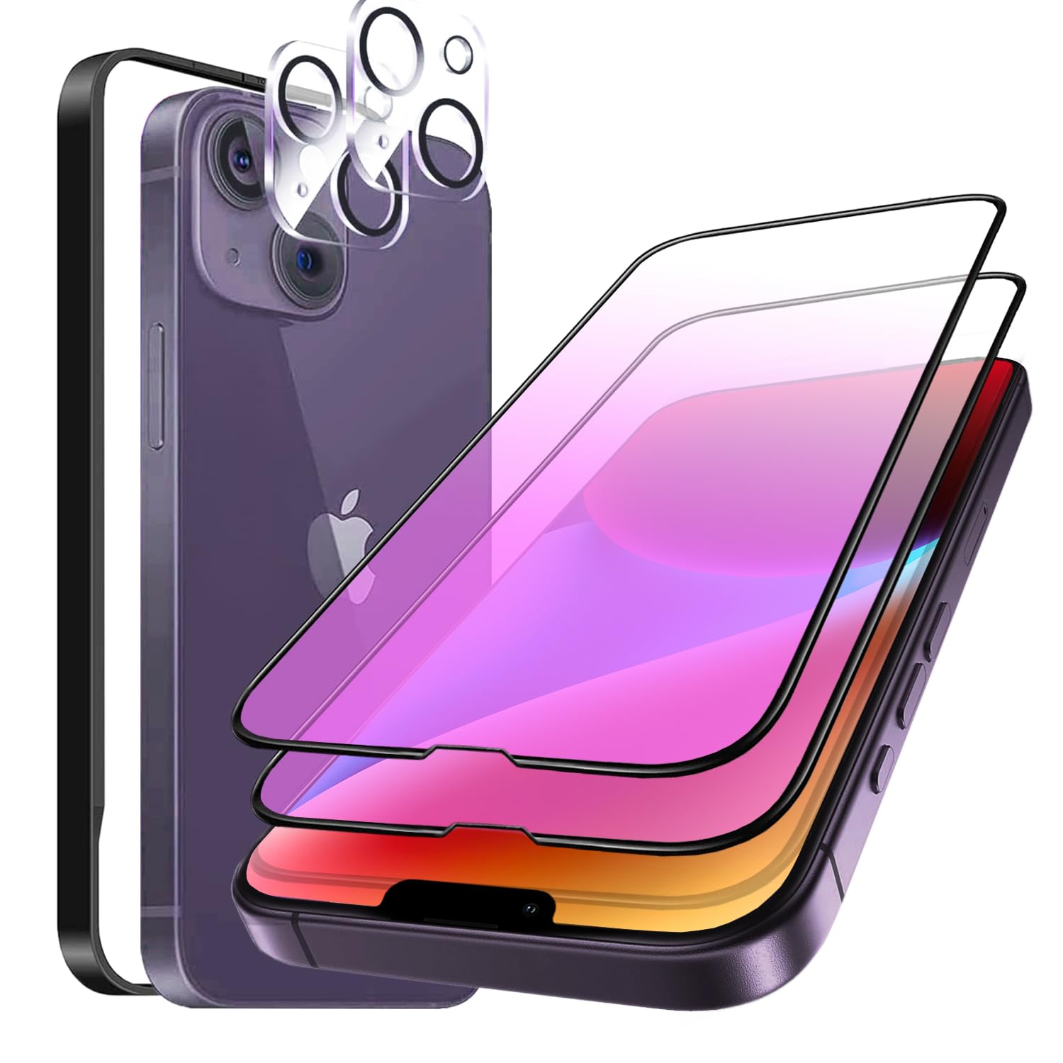 【4枚入り】ガラスフィルム iPhone 14 用 ブルーライトカット 全面保護 目の疲れを軽減 液晶保護フィルム 6.1インチ対応 気泡ゼロ 指紋防止 ガイド枠付き 貼り付け簡単 【アイフォン14 強化ガラスフィルム(2枚入り)+レンズ保護フィルム (2