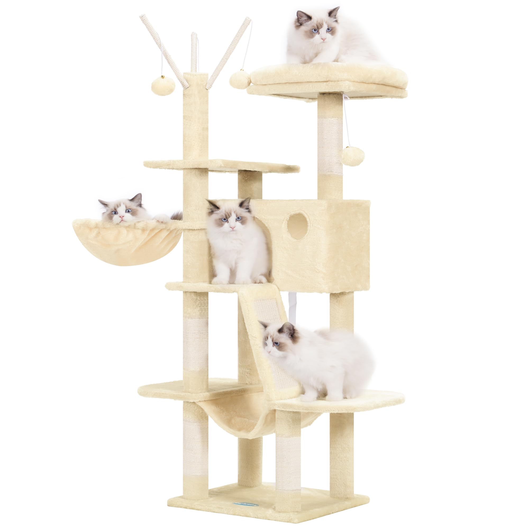 Hey-brother キャットタワー スリム 省スペース 猫タワーおしゃれ 登りやすい 大きな猫屋 天然シサル爪研ぎ板 爪とぎ おもちゃ ハンモック クッション入りベッド 高さ135 cm 幼猫や小型猫に適しています ベージュ JMPJ019-SM