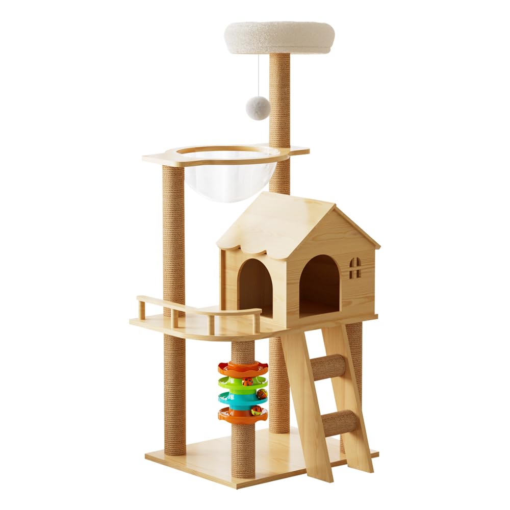Elegaif キャットタワー 木製 猫タワー 合板 スリム 大型猫用 据え置き 省スペース 透明ボウル 宇宙船付き 多頭飼い 猫ハウス 太った猫 シニア猫 短足猫 子猫向け 見晴台 頑丈 安定感 天然麻紐 多ステップ 階段付き 爪とぎ 運動不足解消
