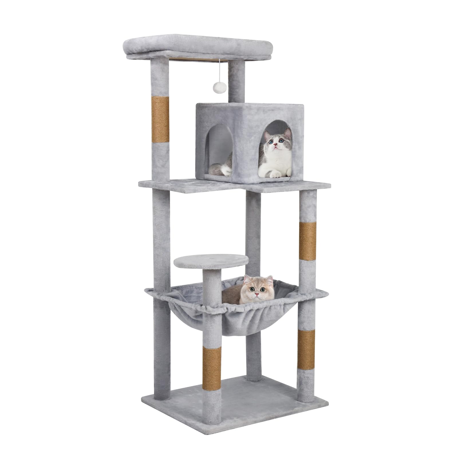 PETEPELA(ぺテぺラ) キャットタワー 猫タワー スリム 大型猫 据え置き 省スペース 登りやすい ハンモック 見晴台 ねこハウス ボンボン 天然麻紐 爪とぎ 運動不足解消 多頭飼い グレー 高さ143cm