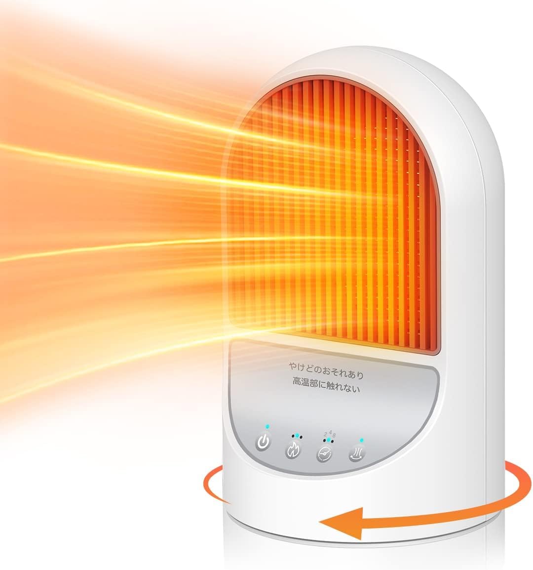 ・・・【2秒で瞬時に暖まる!】小型ですがパワフルな強力温風!電源を入れてわずか2秒で即暖!高性能セラミック発熱体が、小型のボディから想像以上のパワフルな温風を吹き出します。エアコンのように暖まるのを待つ必要はありません。寒さを感じた瞬間から、すぐにあなたの空間をポカポカにします。卓上ヒーターとしてデスク上でも、足元ヒーターとしても最適です。・・・【 800Wの省エネ設計で電気代を気にせず使える】消費電力は800Wと、一般的な電気ストーブと比べて低めに設計されているため、経済的です。省エネ設計で、一日中つけていても電気代を気にせずご利用いただけます。ちょっとした寒さ対策や、部分暖房にぴったりの効率的なヒーターです。・・・【PSE認証&多重安全設計でどこでも安心】PSE認証を取得した国内基準適合品です。「転倒自動OFF」 と 「過熱保護機能」 の多重安全設計を搭載してあります。誤って倒れたり、高温になりすぎたりした場合、自動で電源が切れるので、お子様やペットがいるご家庭、トイレヒーターとしての使用、あるいは就寝中でも安心してお使いいただけます。・・・【最大12時間オフタイマー&超静音で快適な睡眠をサポート】最大12時間のオフタイマー機能付き。就寝前にセットすれば、暖かくして眠りにつき、朝までつけっぱなしになる心配がありません。さらに、超静音設計のため、睡眠の邪魔をすることなく、快適な暖房空間を作り出します。寝室用のヒーターとしても理想的な一台です。・・・【 リモコン操作&軽量コンパクトで家中どこでも大活躍】リモコン操作で、ベッドやソファに座ったままの操作が可能。わざわざ暖房機の前に移動する必要がなく、より快適にご利用いただけます。軽量でコンパクト、かつ持ち運びに便利なハンドル付き設計なので、リビング、寝室、オフィス、脱衣所、トイレなど、家中どこでも簡単に移動させて使用可能。一台あれば家中のあらゆるシーンで大活躍すること間違いなしです。