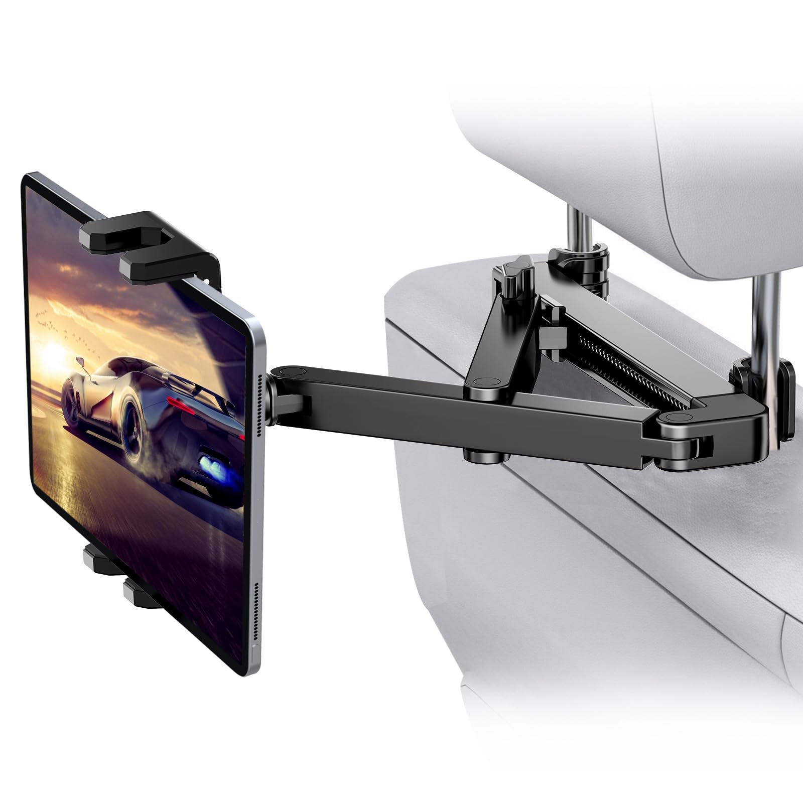 車用ヘッドレスト用タブレットホルダー [3 in 1 三角延長アーム] バックシート用iPad車載ホルダー、子供用のロードトリップ必需品、4.7インチから14.6インチのタブレットとスマートフォン対応のiPad車載マウント、iPad Pro、Air、Min