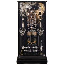 関連キーワードリンク 大型破魔弓(21号~) 4万円以上 本格破魔弓 25号 彫金龍虎 武光 サイズ | 横幅42×奥行30×高さ86cm 迫力ある25号サイズ。近年では最も大きなサイズの破魔弓飾りです。二本の弓・六本の矢がバランスよくデザインされています。前面には二本の守り刀も配されています。 羽根は銀鶏鳥の天然羽根を使用。銀鶏鳥は中国の高山地帯に生息する稀少鳥です。古くより羽ばたく姿を見た武将は必ず戦に勝ち、溢れる財宝をもたらす慶鳥として珍重されてきました。 ケース背景には立体的な龍虎が描かれています。青龍と白虎2つの霊獣がにらみ合うことによって魔を除き、龍虎のように強くたくましく育てとの願いが込められています。 《使用素材》 □羽根…銀鶏鳥 □矢筈…樹脂製矢筈 □弦巻…手巻き天然籐 □弓/内板…木製 □ケース…ガラス