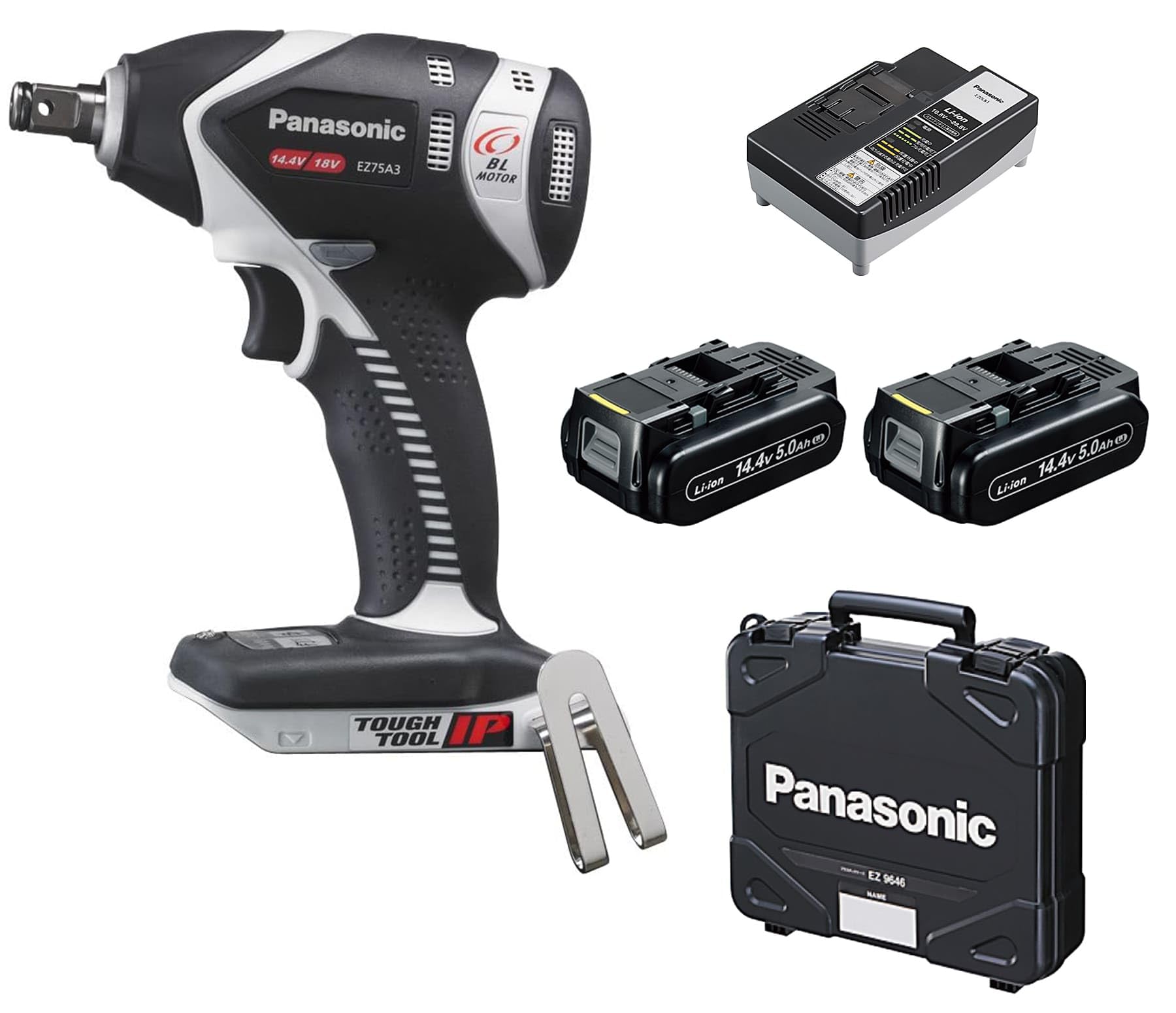 パナソニック 充電インパクトレンチ 18V 5.0Ah電池パック×2個/充電器/ケース デュアル (14.4V/18V対応) 全長小型143mm 280N・m(18V使用時) IP56 EZ75A8LJ2G-B ブラック