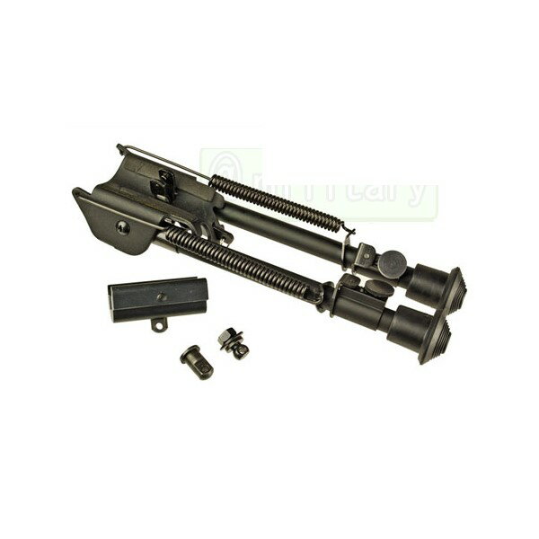 金属製のスプリング式で 折りたたみ&伸縮 可能な便利なバイポット 重量385g(マウント含まず)と高い保持力にもかかわらず軽量な為 未使用時も負担になり難い使い勝手のよい製品です。 高さは 最短18cm〜 最長28cmまでネジ締めにより状況に応じた高さに調節可能です。 最大長からワンボタンで即座に足を伸縮できるバネ機構も搭載。 M14やM24等に対応するバイポットアダプターが付属する他 20mmレール用のマウントが付属するため、 スナイパーライフルだけでなく、M4系など幅広い小銃に接続が可能です。 固定脚部分はゴム製で高い保持力を持ちます。
