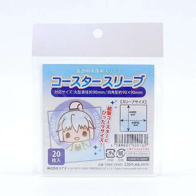 コースターを保護するための透明スリーブです。 丸型、四角型どちらの形でも使用可能です。 高透明なので、スリーブ内のコースターが綺麗に見えます。 スリーブを付けた状態で、コアデ製のコースター収納ホルダー各種にぴったり収納することが出来ます ■対応サイズ:約W90×H90mm 厚さ1mmまで ■入り数:20枚入 ■素材:外装/プラ、台紙/紙、本体/OPP 厚み0.06mm ※コースターは付属しません。 日本製 made in japan