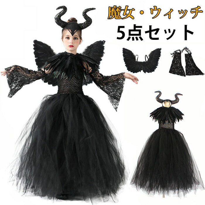 ハロウィン コスプレ 衣装 子供 魔女 お姫様 ワンピース 黒 コスチューム 女の子 プリンセス 魔女 小悪魔 5点セット なりきり 翼付き 仮装 変装 演出 プレゼント ギフト イベント パーティー キャラクター 95-155cm