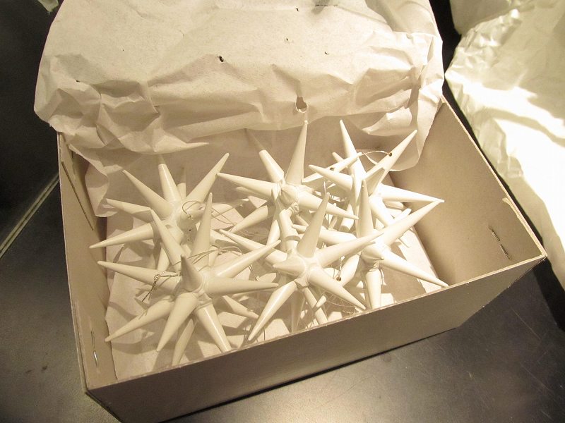 立体の存在感のある白い星。約7cmLの6個、箱入りのセットです。 ドイツザイフェンの木製の美しい星です。