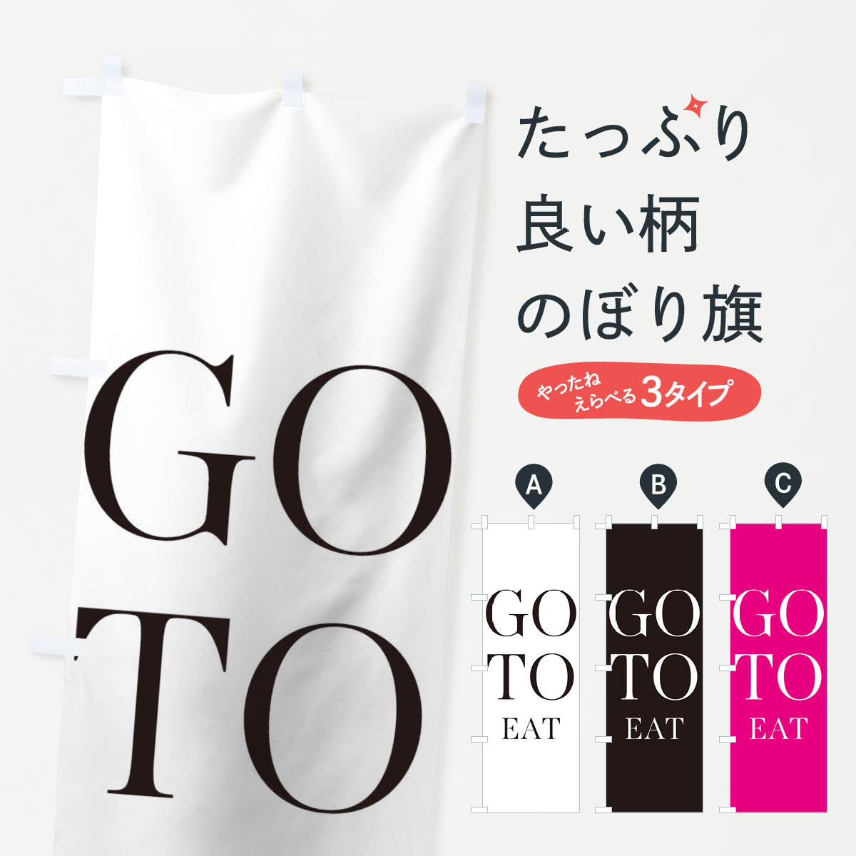 グッズプロののぼり旗は「節約じょうずのぼり」から「セレブのぼり」まで細かく調整できちゃいます。のぼり旗にひと味加えて特別仕様に一部を変えたい店名、社名を入れたいもっと大きくしたい丈夫にしたい長持ちさせたい防炎加工両面別柄にしたい飾り方も選べます壁に吊るしたい全面柄で目立ちたい紐で吊りたいピンと張りたいチチ色を変えたいちょっとおしゃれに看板のようにしたいのぼり旗、他にもあります。GOTOEATのぼり旗内容・記載の文字印刷自社生産 フルカラーダイレクト印刷またはシルク印刷デザイン【A】【B】【C】からお選びください。※モニターの発色によって実際のものと色が異なる場合があります。名入れ、デザイン変更(セミオーダー)などのデザイン変更が気楽にできます。以下から別途お求めください。サイズサイズの詳細については上の説明画像を御覧ください。ジャンボにしたいのぼり重量約80g素材のぼり生地:ポンジ(テトロンポンジ)一般的なのぼり旗の生地通常の薄いのぼり生地より裏抜けが減りますがとてもファンが多い良い生地です。おすすめA1ポスター:光沢紙(コート紙)チチチチとはのぼり旗にポールを通す輪っかのことです。のぼり旗が裏返ってしまうことが多い場合は右チチを試してみてください。季節により風向きが変わる場合もあります。チチの色変え※吊り下げ旗をご希望の場合はチチ無しを選択してください対応のぼりポール一般的なポールで使用できます。ポールサイズ例:最大全長3m、直径2.2cmまたは2.5cm※ポールは別売りです ポール3mのぼり包装1枚ずつ個別包装 PE袋(ポリエチレン)包装時サイズ:約20x25cm横幕に変更横幕の画像確認をご希望の場合は、決済時の備考欄に デザイン確認希望 とお書き下さい。※横幕をご希望でチチの選択がない場合は上のみのチチとなります。ご注意下さい。のぼり補強縫製見た目の美しい四辺ヒートカット仕様。ハトメ加工をご希望の場合はこちらから別途必要枚数分お求め下さい。三辺補強縫製 四辺補強縫製 棒袋縫い加工のぼり防炎加工特殊な加工のため制作にプラス2日ほどいただきます。防炎にしたい・商標権により保護されている単語ののぼり旗は、使用者が該当の商標の使用を認められている場合に限り設置できます。・設置により誤解が生じる可能性のある場合は使用できません。(使用不可な例 : AEDがないのにAEDのぼりを設置)・裏からもくっきり見せるため、風にはためくために開発された、とても薄い生地で出来ています。・屋外の使用は色あせや裁断面のほつれなどの寿命は3ヶ月・・6ヶ月です。※使用状況により異なり、屋内なら何年も持ったりします。・雨風が強い日に表に出すと寿命が縮まります。・濡れても大丈夫ですが、中途半端に濡れた状態でしまうと濡れた場所と乾いている場所に色ムラが出来る場合があります。・濡れた状態で壁などに長時間触れていると色移りをすることがあります。・通行人の目がなれる頃(3ヶ月程度)で違う色やデザインに替えるなどのローテーションをすると効果的です。・特別な事情がない限り夜間は店内にしまうなどの対応が望ましいです。・洗濯やアイロン可能ですが、扱い方により寿命に影響が出る場合があります。※オススメはしません自己責任でお願いいたします。色落ち、色移りにご注意ください。商品コード : 2AYR問い合わせ時にグッズプロ楽天市場店であることと、商品コードをお伝え頂きますとスムーズです。改造・加工など、決済備考欄で商品を指定する場合は上の商品コードをお書きください。ABCGOTOEATのぼり旗 安心ののぼり旗ブランド 「グッズプロ」が制作する、おしゃれですばらしい発色ののぼり旗。デザインを3色展開することで、カラフルに揃えたり、2色を交互にポンポンと並べて楽しさを演出できます。文字を変えたり、名入れをしたりすることで、既製品とは一味違う特別なのぼり旗にできます。 裏面の発色にもこだわった美しいのぼり旗です。のぼり旗にとって裏抜け(裏側に印刷内容が透ける)はとても重要なポイント。通常のぼり旗は表面のみの印刷のため、風で向きが変わったときや、お客様との位置関係によっては裏面になってしまう場合があります。そこで、当店ののぼり旗は表裏の見え方に差が出ないように裏抜けにこだわりました。裏抜けの美しいのグッズプロののぼり旗は裏面になってもデザインが透けて文字や写真がバッチリ見えます。裏抜けが悪いと裏面が白っぽく、色あせて見えてしまいズボラな印象に。また視認性が悪く文字が読み取りにくいなどマイナスイメージに繋がります。いろんなところで使ってほしいから、追加料金は必要ありません。裏抜けの美しいグッズプロののぼり旗でも、風でいつも裏返しでは台無しです。チチの位置を変えて風向きに沿って設置出来ます。横幕はのぼり旗と同じデザインで作ることができるので統一感もアップします。場所に合わせてサイズを変えられます。サイズの選び方を見るミニ