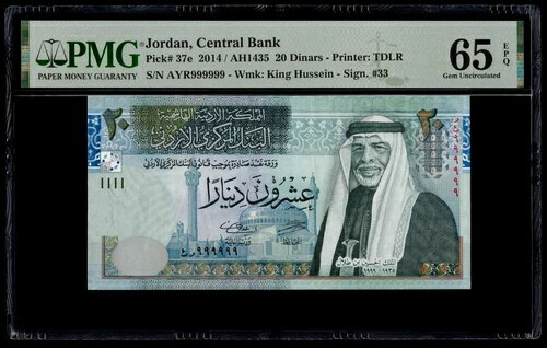 ジョーダン 2014 - 20 ディナール P#37e **レア プレフィックス AYR + ソリッド 999999** PMG ジェム UNC 65