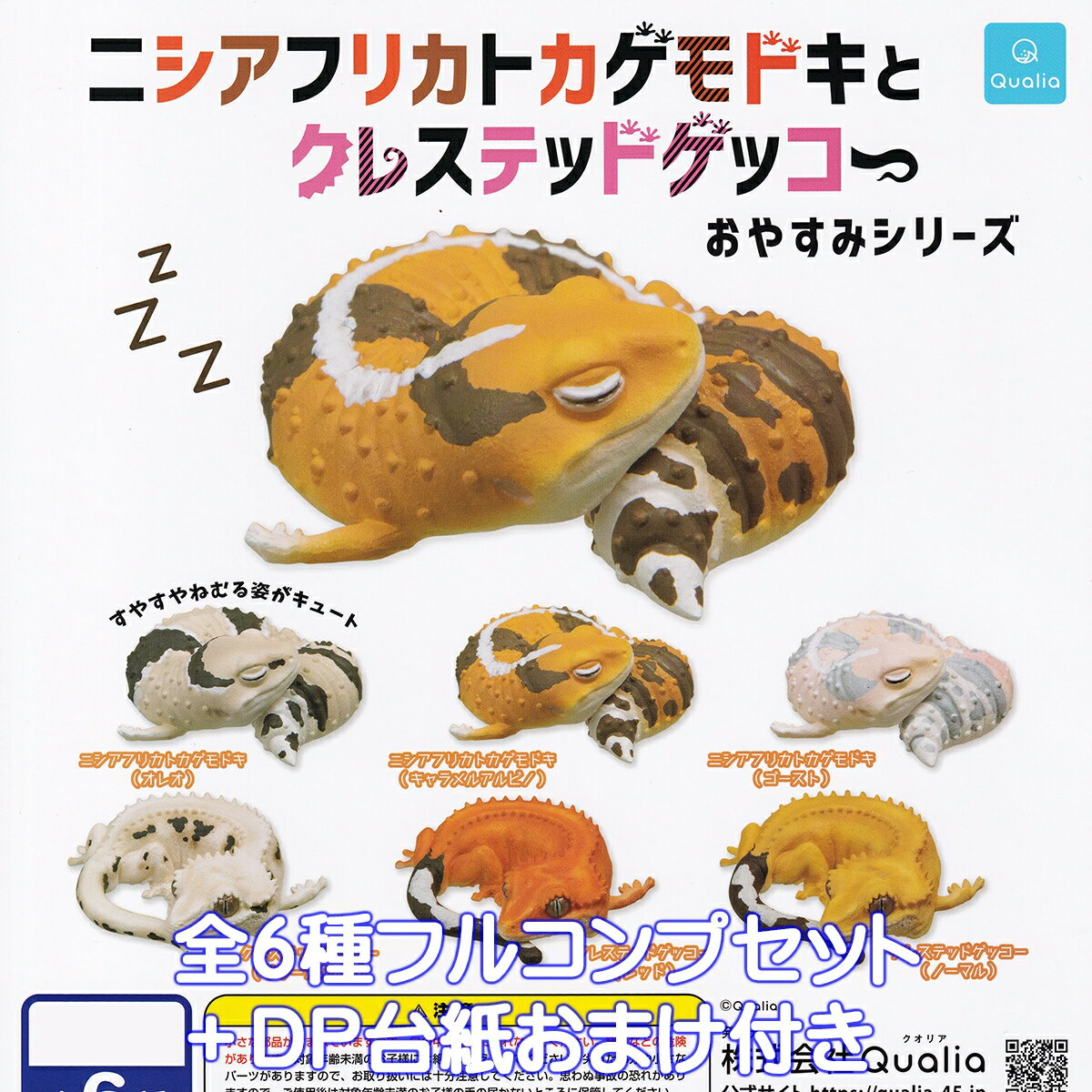 ニシアフリカトカゲモドキとクレステッドゲッコー おやすみシリーズ Qualia 【全6種フルコンプセット+DP台紙おまけ付き】 トカゲ 爬虫類 ミニチュア グッズ フィギュア ガチャガチャ カプセルトイ【即納 在庫品】【数量限定】【フルコンプリート】