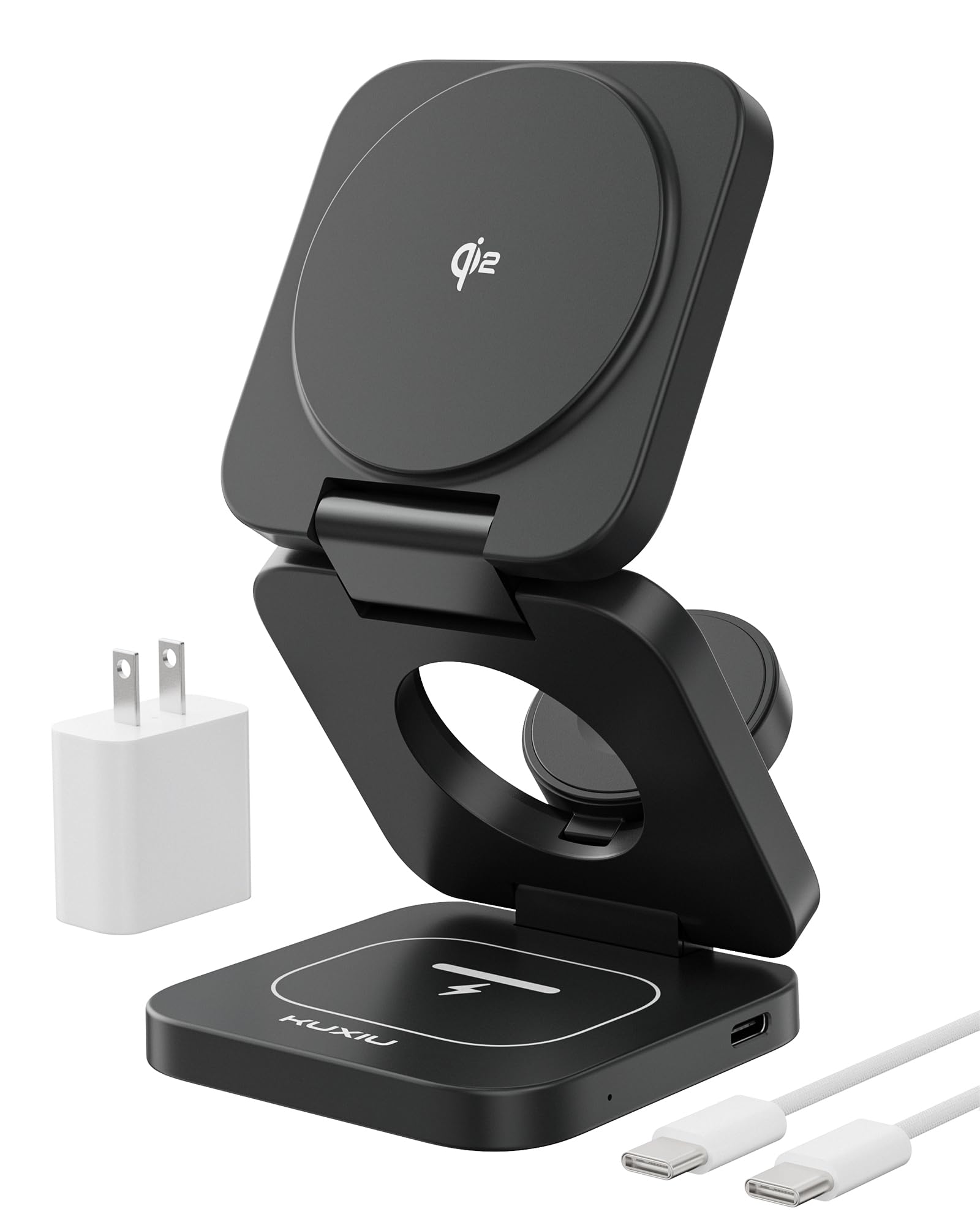 SwanScout 3in1 ワイヤレス充電器、Mag-Safe スタンド、マグセーフ充電器、マグネット式 折りたたみ式ステーション、置くだけ、iPhone 16/15/14/13/12シリーズ対応、iWatch、AirPods対応(アダプター別売り)、S