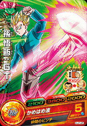 HJ2-45孫悟飯:GT 210018002000 超サイヤ人 2ラウンド目以降アタッカーにすると、カードアクションが発生する。成功すると、変身し、パワー+2000。[1回限り] かめはめ波 5 仲間のピンチ ラウンド開始時、仲間がきぜつしていると、そのラウンドの敵に与えるダメージが2倍になる。[毎回]