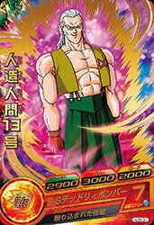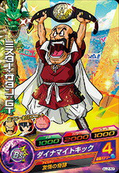 HJ3-10亀仙人 150038001000 亀仙人の超本気 2ラウンド目以降アタッカーにすると、カードアクションが発生する。成功すると、変身し、パワーが3倍、戦闘力が2倍になる。[1回限り] 多重残像拳 4 武天老師の教え バトル開始時、HPとパワーの両方が2000以下の仲間のパワーとガードを2000アップする。さらに、絶対にきぜつしない。ただし、自分には効果が無い。[永続]