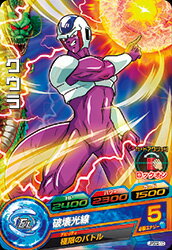 JPBC2-10 クウラ 2400 2300 1500 残酷な攻撃 必殺技が発動できる時にアタッカーにすると、ロックオンした敵を攻撃し、その敵のガード−1000。[1回限り] 破壊光線 5 極限のバトル ラウンド開始時、自分チームのHPが50%以下になっていると、敵に与えるダメージが1.2倍になる。[永続] 配布情報 ドラゴンボールヒーローズ カードグミ12