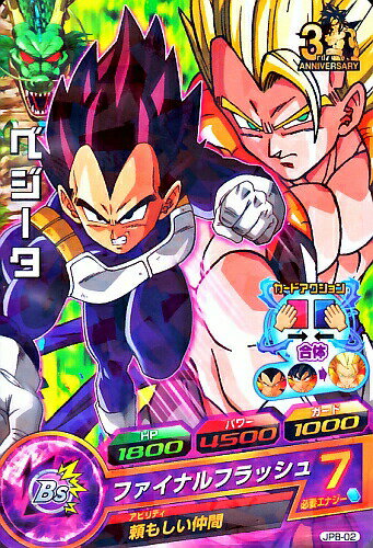HJ8-44 ベジータ:GT 3000 4100 2000 全開パワーの超気弾 3ラウンド目以降アタッカーにすると、自分チームの攻撃終了時、スパーキングモードに突入。スパーキングモードに勝利すると、敵に超ダメージを与える。さらに、超スパーキングすると、パワー+3000。[1回限り] ギャリックブレイザー 7 サイヤ人の闘争本能 ラウンド終了時、自分チームのHPが敵チームより少ないと、チャージインパクトで勝利した時、敵に与えるダメージが2000ずつアップしていく。[毎回]