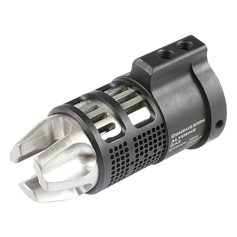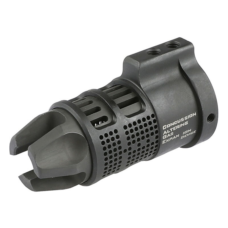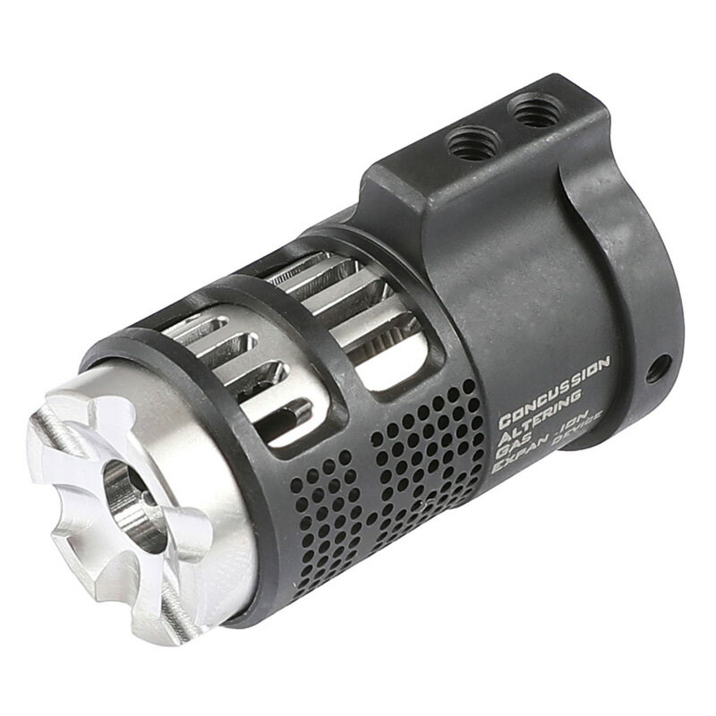 1,000円以下の商品を見る 2,000円以下の商品を見る 3,000円以下の商品を見る 4,000円以下の商品を見る 5,000円以下の商品を見る 6,000円以下の商品を見る商品詳細 CAGEは、GAMMA/EPSILONシリーズフラッシュハイダーと併用することで、より高いリコイル/マズルフラッシュ低減効果を実現するマズルデバイスです。 一般的なマズルレーキに使用されるような、発射ガスの非効率的なエネルギー変換が行われる大型の筒形構造を採らずに、マズルブレーキを密接に包み込むような形状としていることが特徴です。 このことにより、マズルコントロールの向上とリコイル低減両面においてより高い効果が発揮されるようになります。 サイドの小孔は、GAMMA/EPSILONのチャンバーの上に来るように配置されています。 この構造を採ることにより、ガスをより均一なエネルギーに拡散させるのに加えて、ポートを通過させる速度を遅らせることができ、水平方向の振動を低減することが可能となります。 それと同時に、全てのガスポートを通過する際にガスの滞留時間を延長することも可能となっています。 このことにより高いリコイル/マズル低減効果を発揮することができます。 【注意事項】 こちらの製品は海外製エアガンパーツです。下記諸点をご理解の上、ご購入をお願い申し上げます。 ■パッケージの破損や汚れがある場合ございます。 ■商品本体に傷や汚れなどがある場合ございます。 ■成型が甘く、取付に修正、調整が必要な場合がございます。 ■金属パーツに傷、塗装剥がれやサビなどがつく場合ございます。 ■通関時、検査がある為、開封、また使用痕がある場合ございます。