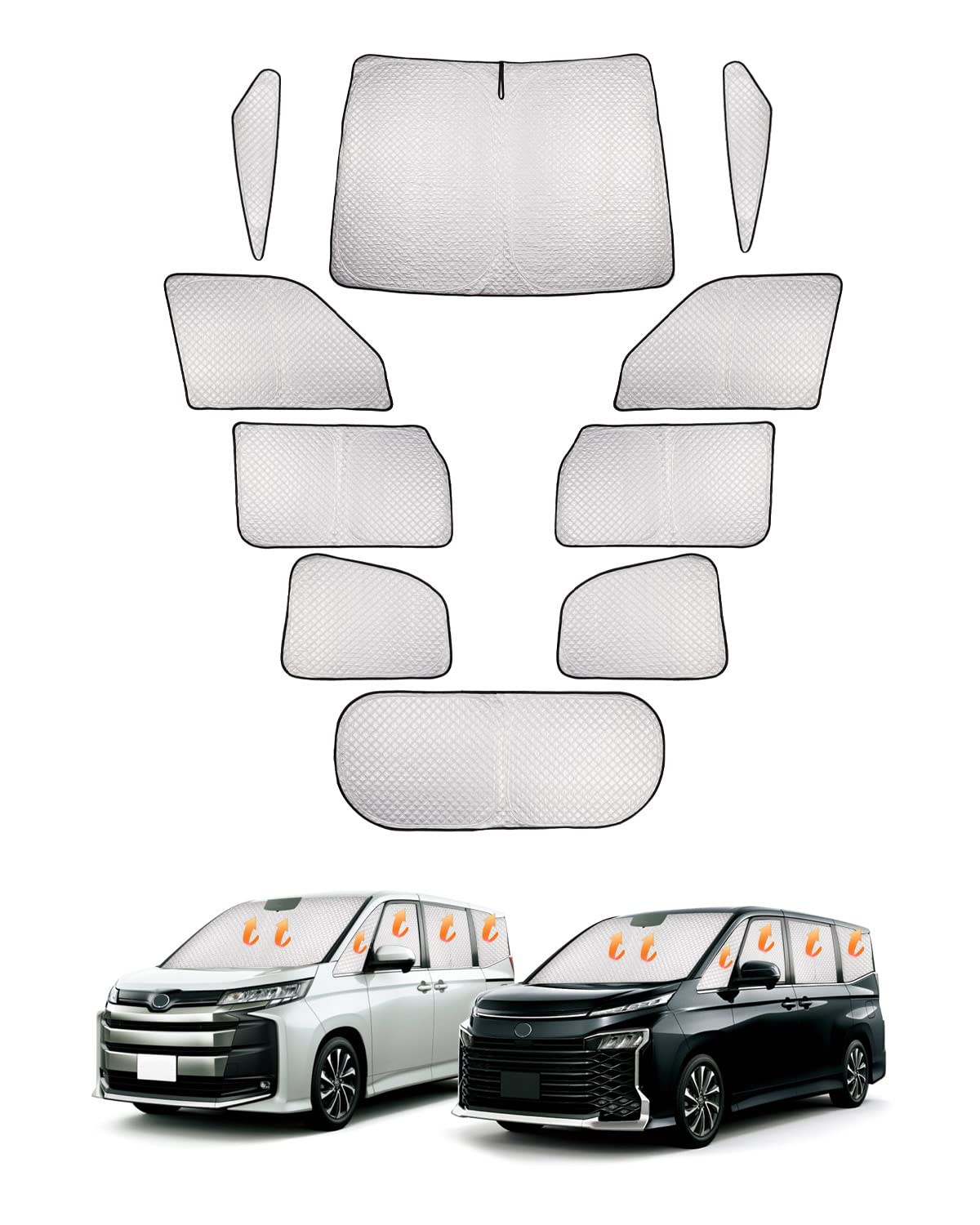 ・1.【適合車種】:トヨタ 新型 ヴォクシー ノア ・VOXY NOAH R90W型。年式:2022年1月・現行。※購入する前、形状、年式とモデルを確認してください。・2.【セット内容】フロントガラス用x1枚、フロントドアガラス用x2枚、リアガラス用x2枚、三列目ガラス用×2枚、三角ガラス用x2枚、リアハッチガラス用x1枚[合計10枚]収納袋付き。※リアウィンドウサンシェードを固定する付属品合計6個となります。使用方法:リアウィンドウの隙間に差し込んでからリアサンシェードを取り付けます。※取り付けに関してご不明な点がございましたら、お気軽にお問い合わせください。・3.【高品質6層構造・断熱・保温・UVカット】アップグレードと厚み付け、アルミホイルの6層、より多くの日陰、より多くの断熱。表面に銀塗った素材を使用、裏面に黒色断熱材質を使用、熱放射の遮断、遮光、冷却の効果が大幅に向上します。遮光・断熱・保温・プライバシー保護のための必需品となっております。一年中使えるカーサンシェード。車中泊も快適です。・4.【車内内装・プライバシー保護・盗難防止】紫外線防止・室内劣化・冷房防止。UVカットの特殊生地で太陽光の熱エネルギーのスペクトルを反射して99%の有害な紫外線を効果的に遮断し、駐車時の日光から車を守り、ハンドルやけやシートなどの内装の日焼けを抑えて愛車を守ります。6層の断熱材を使用することで、車内の温度を下げ、空調負荷を減らし、燃費を向上させることができます。車上荒らしから大切な愛車を守る鉄則、それは外からの視線を遮ることです。物色されないので盗難防止効果があります。ドライブとアウトドアが好きな方にオススメ、ぜひ体験してみてください。・5.【車種専用設計・装着や収納が簡単】完全車種専用設計で、窓の形にぴったり合うように設計されています。車窓やサンシェードは隙間が無いです。サンバイザーで挟み込むように押さえるだけと、簡単に設置できる手軽さも魅力です。折りたたみ式、着脱が簡単,使わないときは、折りたたんで収納完了。