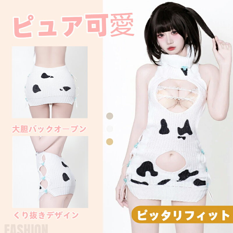 【即納】SENMHS セクシー カウ柄セーター ロリータ風 ニット 上下開き 背中・胸開き ハイネック 透かし編み レディース ファッション コスプレ イベント パーティー 撮影会