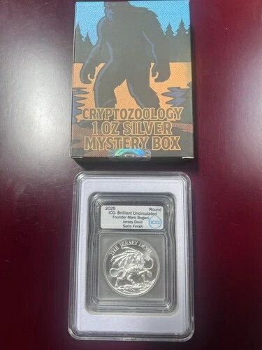 1オンス シルバー 2025 インタリオ ミント 未確認動物学ミステリーボックス ICG によるグレーディング済み - 未開封。