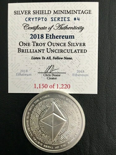 10%割引 Silver Shield Ethereum 2018 1オンス BUラウンド ミニミント 暗号 COA付き