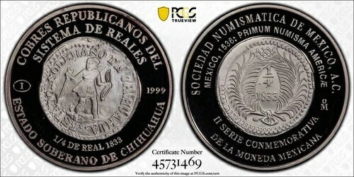 1999年 ミズーリ州メキシコ貨幣協会 1833年 1/4R チワワ シルバーメダル PCGS SP69