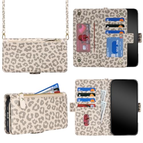 DEYHU 対応 いphone16 ケース 手帳型 ショルダー ジッパー式 カード収納 iphone16 ケース ファスナー 財布型 肩掛け 大容量 耐衝撃 調節可能な アイフォン16 カバー スタンド機能 フェイクレザー 携帯ケース - ベージュレオパー