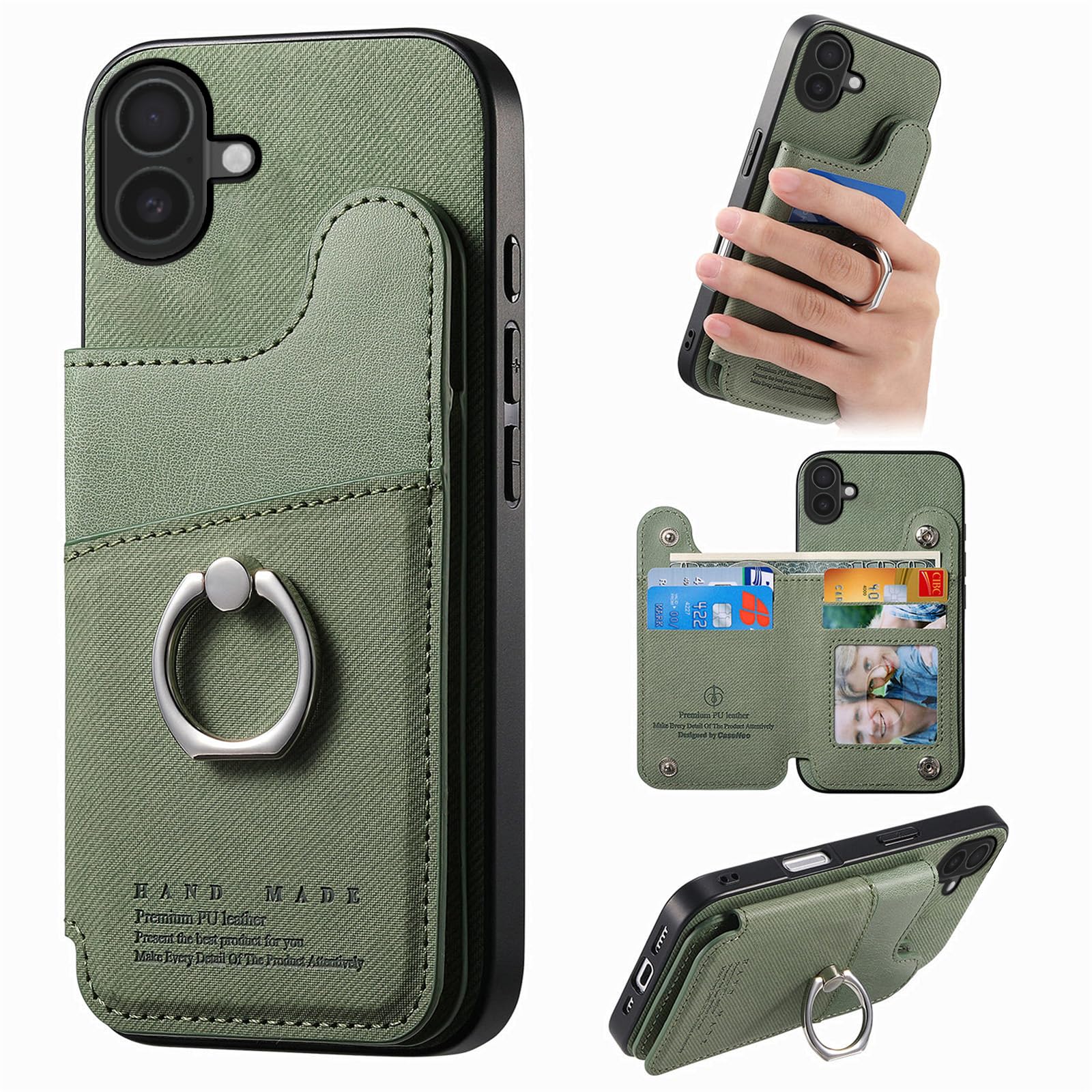 For iPhone 16 Plus ケース 手帳型 アイフォン16プラス カバー 背面カード収納&スタンド機能付き 360度回転リング 財布型 耐衝撃 TPU全面保護 【RFIDブロッキング/PUレザー】グリーン