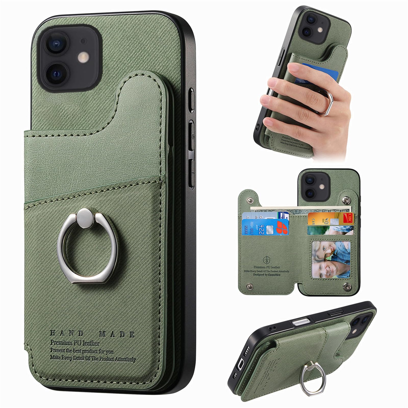 ・対応機種:このケースはiPhone 12/12Pro 6.1インチに対応しており、ご購入前にお使いの機種をご確認ください。・上質な素材:このいphone12 pro ケースには背面に上質なPUレザーを使用しており、防水、防塵、防指紋に優れ、シンプルで手触りの良いデザインです。ケースの部分には弾力性の優れたTPU素材を採用しており、落下時の衝撃を吸収します。また脱着も簡単でスマホ本体をしっかりと保護します。・カード収納:このスマホケース iphone 12 手帳型の背面には、5つのカードポケットがあり、クレジットカードやレシート、名刺、お札などをしっかり収納できます。さらに、クリア窓付きポケットには写真やステッカーを入れて、自分だけのアレジオンを楽しめます。・リング付き:このアイフォン12 ケースには使いやすさと安全性を両立したリングが付いており、電話をかけるときに指を通して持つことで落下防止に対応できます。また、リング部分は360度回転し、お好みの向きと角度に調整可能です。スタンドとしても使用できるため、ビデオ通話やビジネスミーティングなど、どんな場面でも便利に使えます。・カメラ保護:このiphone12プロ ケースには、カメラ穴はレンズより高く設計されています。これにより、スマートフォンをテーブルの上に置いた際に、レンズがテーブルの表面と直接接触することを防ぎ、傷つきにくくしています。大切なカメラを保護し、美しい写真や動画を安全に撮影できるように配慮されたデザインです。1.素材:背面には高品質なPUレザーで作られており、耐久性があります。ケースの部分にはTPU素材を採用しており、脱着も簡単で、スマホ本体をしっかりと保護します。 2.留め金具:磁石を使わずに留めるボタンを採用しています。これにより、磁気によるカードへの影響を防ぎ、安心して使用できます。また、ボタン式の留め具はしっかりと固定でき、必要なときに安全かつ簡単に開閉できます。さらに、カードや小物の取り出しがスムーズになり、使い勝手が向上しています。 3.スキミング防止機能:RFIDブロッキング素材を使用して、ICカードなどの個人情報を保護します。ご注意:この機能により信号がブロックされることがありますので、改札口ではカードをケースから出してご利用いただくことをお勧めします。