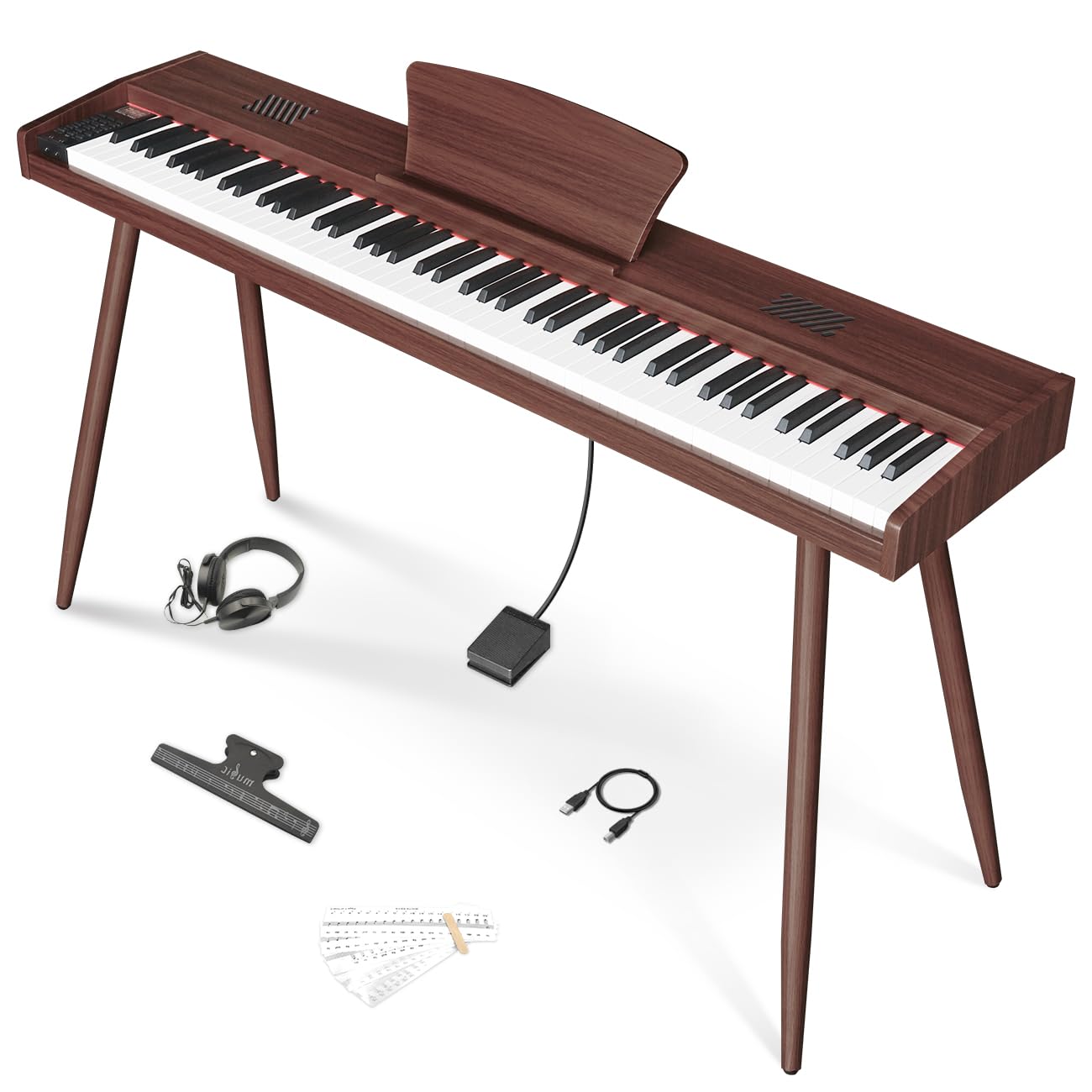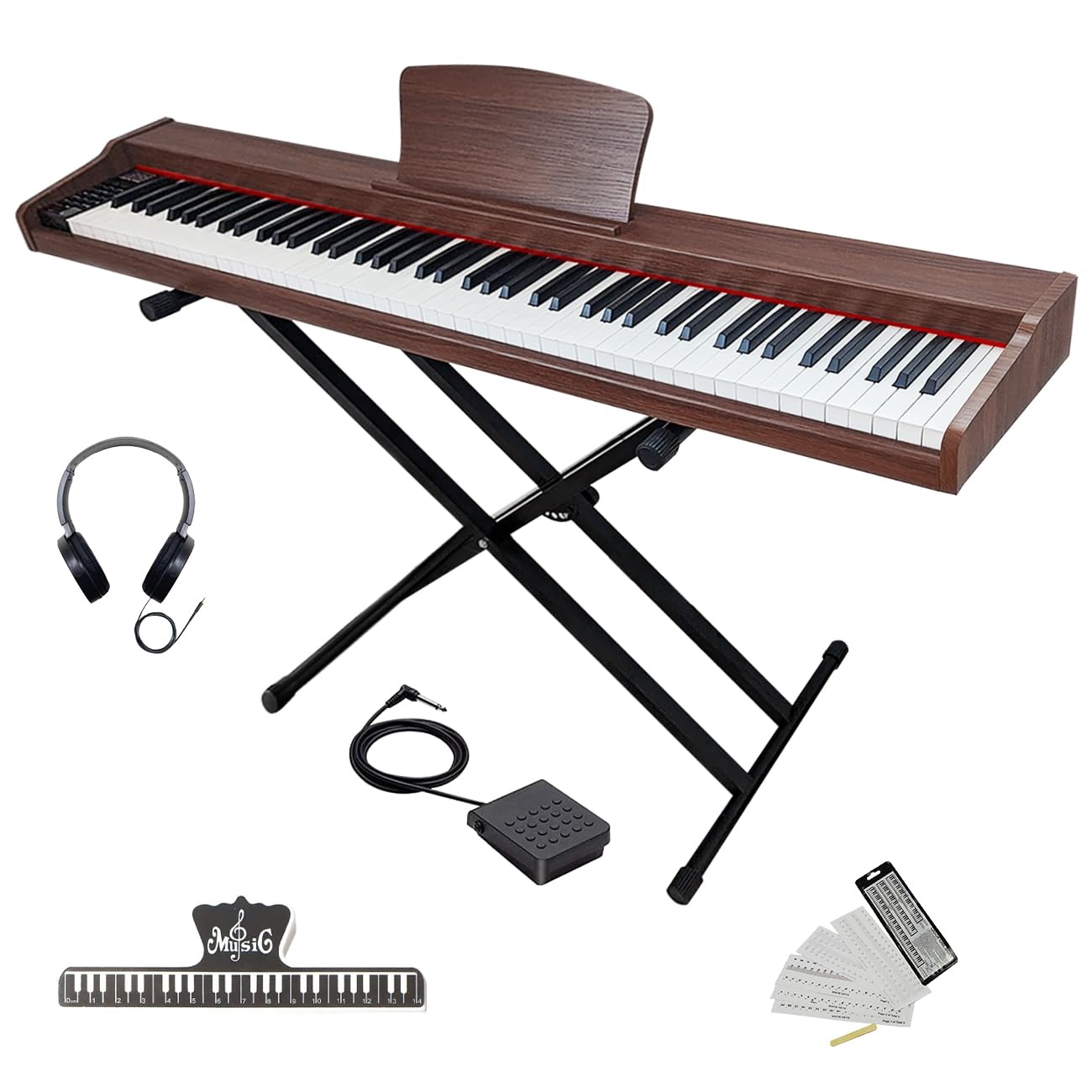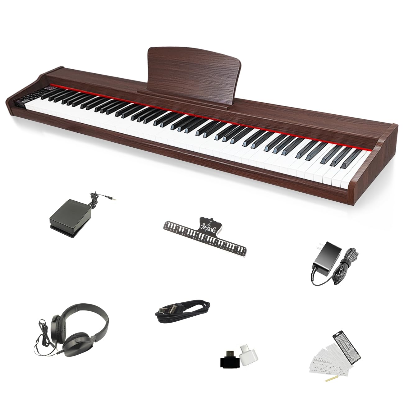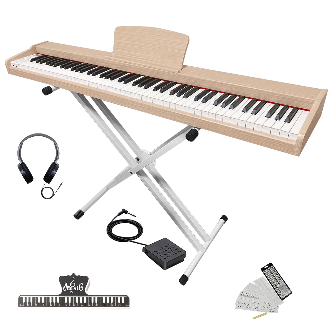 ・【88鍵盤電子ピアノ】セット内容:ピアノ本体、譜面台、サステインペダル、アダプター、日本語説明書 木調目なデザインや同じ色の木製譜面台で、温もり雰囲気が溢れます。最大同時発音数も128音とし、生ピアノと同じサイズ鍵盤で演奏の快感が広がります。・【機能たっぷり】初心者には欠かせない機能が満載!移調機能、自動伴奏機能、テンポ調節、メトロノーム、380種類音色、128種類リズム、80デモ曲をご用意しました。・【二人鍵盤モード&二つヘッドホンを同時使用】二人鍵盤の搭載に加え、二つヘッドホン同時使用機能を追加しました!友人と音楽を通じてつながり、音楽の共鳴を感じる素晴らしい瞬間を共有しましょう。・【MIDI機能対応】本製品をiPad、iPhoneなどのiOS搭載デバイスと連動しピアノアプリが楽しめます。また、パソコンと接続すればMIDI信号の送受信が可能、音楽の録音や編集、ピアノの練習、どちらも簡単にコントロールできます。・【指力感知機能搭載】鍵盤を弾く強さによる音の強弱の表現ができますので曲の音量の微妙な変化を楽しむことができます。【安心な1年保証】ご購入頂いた電子子ピアノは1年間メーカー保障が付いております、商品の品質には万全を期しておりますが、万が一商品に不具合等発生したら、いつでもお気軽に出品者にお問い合わせください、迅速に無料交換や返金対応させていただきます。ご安心ください。電子ピアノ 88鍵盤