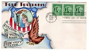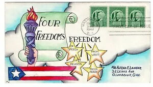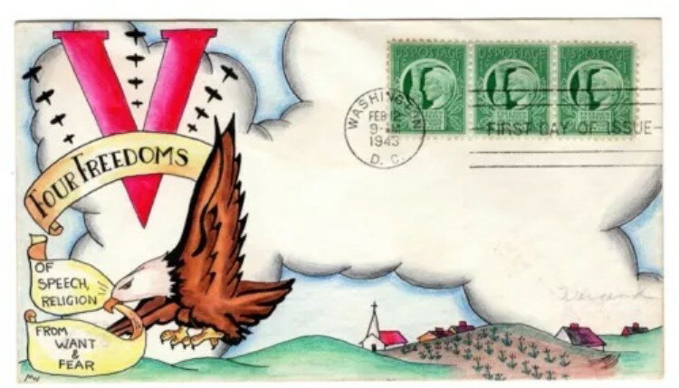 #908 四つの自由 ドロシー・ナップ 手描きカシェ 1943年 第二次世界大戦初日カバー