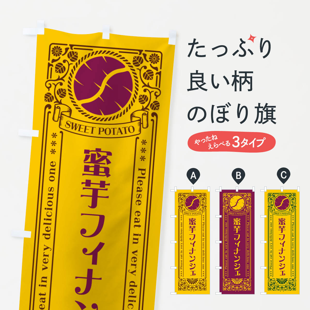 グッズプロののぼり旗は「節約じょうずのぼり」から「セレブのぼり」まで細かく調整できちゃいます。のぼり旗にひと味加えて特別仕様に一部を変えたい店名、社名を入れたいもっと大きくしたい丈夫にしたい長持ちさせたい防炎加工両面別柄にしたい飾り方も選べます壁に吊るしたい全面柄で目立ちたい紐で吊りたいピンと張りたいチチ色を変えたいちょっとおしゃれに看板のようにしたいスイーツその他のぼり旗、他にもあります。【ネコポス送料360】 のぼり旗 蜜芋フィナンシェ・さつまいも・昔風・レトロ風のぼり GXG0 スイーツ内容・記載の文字蜜芋フィナンシェ・さつまいも・昔風・レトロ風印刷自社生産 フルカラーダイレクト印刷またはシルク印刷デザイン【A】【B】【C】からお選びください。※モニターの発色によって実際のものと色が異なる場合があります。名入れ、デザイン変更(セミオーダー)などのデザイン変更が気楽にできます。以下から別途お求めください。サイズサイズの詳細については上の説明画像を御覧ください。ジャンボにしたいのぼり重量約80g素材のぼり生地:ポンジ(テトロンポンジ)一般的なのぼり旗の生地通常の薄いのぼり生地より裏抜けが減りますがとてもファンが多い良い生地です。おすすめA1ポスター:光沢紙(コート紙)チチチチとはのぼり旗にポールを通す輪っかのことです。のぼり旗が裏返ってしまうことが多い場合は右チチを試してみてください。季節により風向きが変わる場合もあります。チチの色変え※吊り下げ旗をご希望の場合はチチ無しを選択してください対応のぼりポール一般的なポールで使用できます。ポールサイズ例:最大全長3m、直径2.2cmまたは2.5cm※ポールは別売りです ポール3mのぼり包装1枚ずつ個別包装 PE袋(ポリエチレン)包装時サイズ:約20x25cm横幕に変更横幕の画像確認をご希望の場合は、決済時の備考欄に デザイン確認希望 とお書き下さい。※横幕をご希望でチチの選択がない場合は上のみのチチとなります。ご注意下さい。のぼり補強縫製見た目の美しい四辺ヒートカット仕様。ハトメ加工をご希望の場合はこちらから別途必要枚数分お求め下さい。三辺補強縫製 四辺補強縫製 棒袋縫い加工のぼり防炎加工特殊な加工のため制作にプラス2日ほどいただきます。防炎にしたい・商標権により保護されている単語ののぼり旗は、使用者が該当の商標の使用を認められている場合に限り設置できます。・設置により誤解が生じる可能性のある場合は使用できません。(使用不可な例 : AEDがないのにAEDのぼりを設置)・裏からもくっきり見せるため、風にはためくために開発された、とても薄い生地で出来ています。・屋外の使用は色あせや裁断面のほつれなどの寿命は3ヶ月〜6ヶ月です。※使用状況により異なり、屋内なら何年も持ったりします。・雨風が強い日に表に出すと寿命が縮まります。・濡れても大丈夫ですが、中途半端に濡れた状態でしまうと濡れた場所と乾いている場所に色ムラが出来る場合があります。・濡れた状態で壁などに長時間触れていると色移りをすることがあります。・通行人の目がなれる頃(3ヶ月程度)で違う色やデザインに替えるなどのローテーションをすると効果的です。・特別な事情がない限り夜間は店内にしまうなどの対応が望ましいです。・洗濯やアイロン可能ですが、扱い方により寿命に影響が出る場合があります。※オススメはしません自己責任でお願いいたします。色落ち、色移りにご注意ください。商品コード : GXG0問い合わせ時にグッズプロ楽天市場店であることと、商品コードをお伝え頂きますとスムーズです。改造・加工など、決済備考欄で商品を指定する場合は上の商品コードをお書きください。ABC【ネコポス送料360】 のぼり旗 蜜芋フィナンシェ・さつまいも・昔風・レトロ風のぼり GXG0 スイーツ 安心ののぼり旗ブランド 「グッズプロ」が制作する、おしゃれですばらしい発色ののぼり旗。デザインを3色展開することで、カラフルに揃えたり、2色を交互にポンポンと並べて楽しさを演出できます。文字を変えたり、名入れをしたりすることで、既製品とは一味違う特別なのぼり旗にできます。 裏面の発色にもこだわった美しいのぼり旗です。のぼり旗にとって裏抜け(裏側に印刷内容が透ける)はとても重要なポイント。通常のぼり旗は表面のみの印刷のため、風で向きが変わったときや、お客様との位置関係によっては裏面になってしまう場合があります。そこで、当店ののぼり旗は表裏の見え方に差が出ないように裏抜けにこだわりました。裏抜けの美しいのグッズプロののぼり旗は裏面になってもデザインが透けて文字や写真がバッチリ見えます。裏抜けが悪いと裏面が白っぽく、色あせて見えてしまいズボラな印象に。また視認性が悪く文字が読み取りにくいなどマイナスイメージに繋がります。いろんなところで使ってほしいから、追加料金は必要ありません。裏抜けの美しいグッズプロののぼり旗でも、