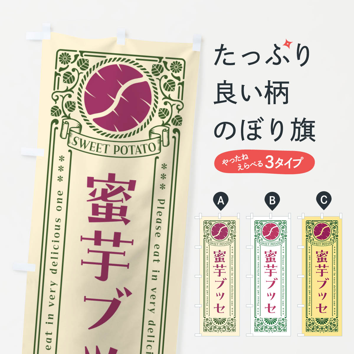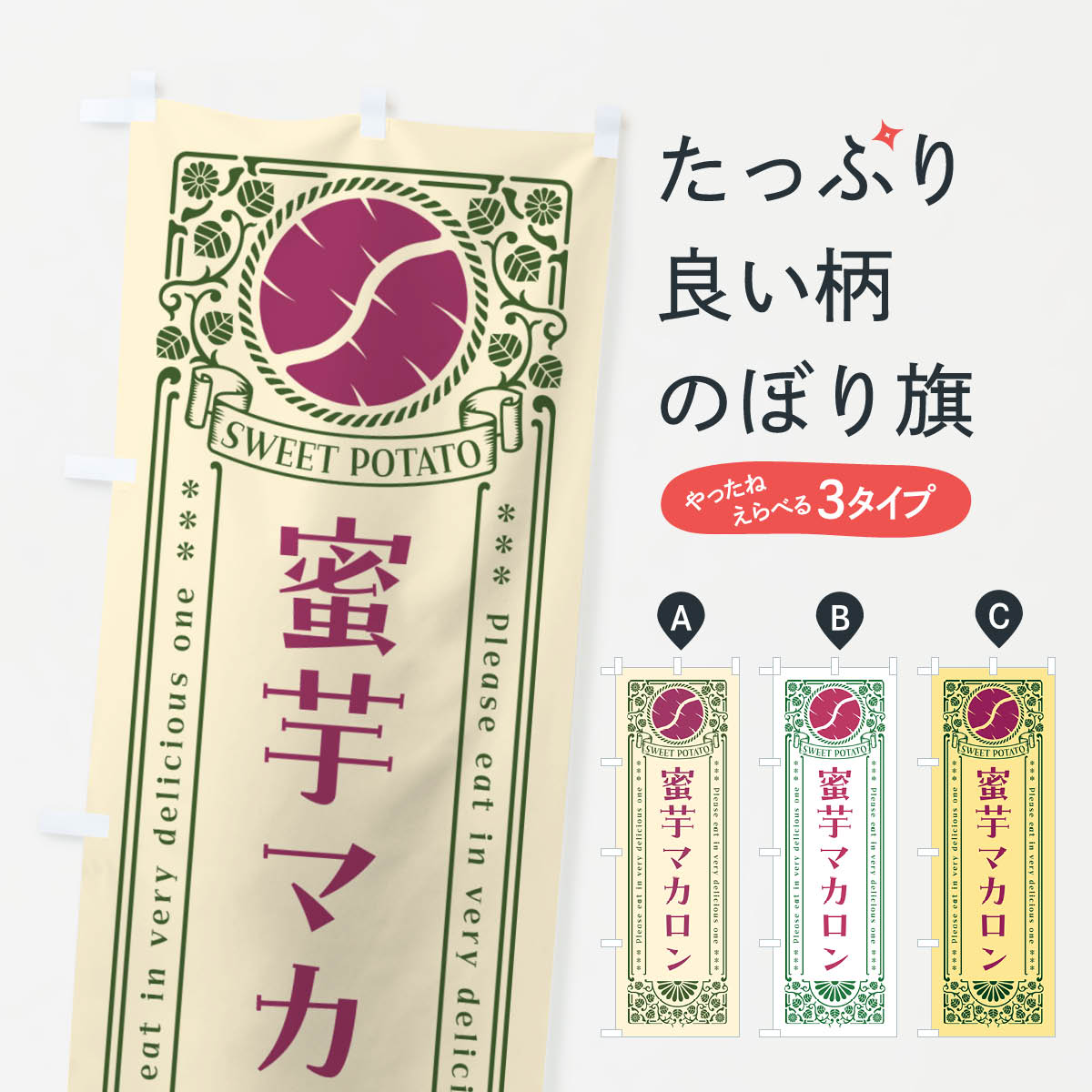 グッズプロののぼり旗は「節約じょうずのぼり」から「セレブのぼり」まで細かく調整できちゃいます。のぼり旗にひと味加えて特別仕様に一部を変えたい店名、社名を入れたいもっと大きくしたい丈夫にしたい長持ちさせたい防炎加工両面別柄にしたい飾り方も選べます壁に吊るしたい全面柄で目立ちたい紐で吊りたいピンと張りたいチチ色を変えたいちょっとおしゃれに看板のようにしたいマカロンのぼり旗、他にもあります。【ネコポス送料360】 のぼり旗 蜜芋マカロン・さつまいも・昔風・レトロ風のぼり GXG3 内容・記載の文字蜜芋マカロン・さつまいも・昔風・レトロ風印刷自社生産 フルカラーダイレクト印刷またはシルク印刷デザイン【A】【B】【C】からお選びください。※モニターの発色によって実際のものと色が異なる場合があります。名入れ、デザイン変更(セミオーダー)などのデザイン変更が気楽にできます。以下から別途お求めください。サイズサイズの詳細については上の説明画像を御覧ください。ジャンボにしたいのぼり重量約80g素材のぼり生地:ポンジ(テトロンポンジ)一般的なのぼり旗の生地通常の薄いのぼり生地より裏抜けが減りますがとてもファンが多い良い生地です。おすすめA1ポスター:光沢紙(コート紙)チチチチとはのぼり旗にポールを通す輪っかのことです。のぼり旗が裏返ってしまうことが多い場合は右チチを試してみてください。季節により風向きが変わる場合もあります。チチの色変え※吊り下げ旗をご希望の場合はチチ無しを選択してください対応のぼりポール一般的なポールで使用できます。ポールサイズ例:最大全長3m、直径2.2cmまたは2.5cm※ポールは別売りです ポール3mのぼり包装1枚ずつ個別包装 PE袋(ポリエチレン)包装時サイズ:約20x25cm横幕に変更横幕の画像確認をご希望の場合は、決済時の備考欄に デザイン確認希望 とお書き下さい。※横幕をご希望でチチの選択がない場合は上のみのチチとなります。ご注意下さい。のぼり補強縫製見た目の美しい四辺ヒートカット仕様。ハトメ加工をご希望の場合はこちらから別途必要枚数分お求め下さい。三辺補強縫製 四辺補強縫製 棒袋縫い加工のぼり防炎加工特殊な加工のため制作にプラス2日ほどいただきます。防炎にしたい・商標権により保護されている単語ののぼり旗は、使用者が該当の商標の使用を認められている場合に限り設置できます。・設置により誤解が生じる可能性のある場合は使用できません。(使用不可な例 : AEDがないのにAEDのぼりを設置)・裏からもくっきり見せるため、風にはためくために開発された、とても薄い生地で出来ています。・屋外の使用は色あせや裁断面のほつれなどの寿命は3ヶ月〜6ヶ月です。※使用状況により異なり、屋内なら何年も持ったりします。・雨風が強い日に表に出すと寿命が縮まります。・濡れても大丈夫ですが、中途半端に濡れた状態でしまうと濡れた場所と乾いている場所に色ムラが出来る場合があります。・濡れた状態で壁などに長時間触れていると色移りをすることがあります。・通行人の目がなれる頃(3ヶ月程度)で違う色やデザインに替えるなどのローテーションをすると効果的です。・特別な事情がない限り夜間は店内にしまうなどの対応が望ましいです。・洗濯やアイロン可能ですが、扱い方により寿命に影響が出る場合があります。※オススメはしません自己責任でお願いいたします。色落ち、色移りにご注意ください。商品コード : GXG3問い合わせ時にグッズプロ楽天市場店であることと、商品コードをお伝え頂きますとスムーズです。改造・加工など、決済備考欄で商品を指定する場合は上の商品コードをお書きください。ABC【ネコポス送料360】 のぼり旗 蜜芋マカロン・さつまいも・昔風・レトロ風のぼり GXG3 安心ののぼり旗ブランド 「グッズプロ」が制作する、おしゃれですばらしい発色ののぼり旗。デザインを3色展開することで、カラフルに揃えたり、2色を交互にポンポンと並べて楽しさを演出できます。文字を変えたり、名入れをしたりすることで、既製品とは一味違う特別なのぼり旗にできます。 裏面の発色にもこだわった美しいのぼり旗です。のぼり旗にとって裏抜け(裏側に印刷内容が透ける)はとても重要なポイント。通常のぼり旗は表面のみの印刷のため、風で向きが変わったときや、お客様との位置関係によっては裏面になってしまう場合があります。そこで、当店ののぼり旗は表裏の見え方に差が出ないように裏抜けにこだわりました。裏抜けの美しいのグッズプロののぼり旗は裏面になってもデザインが透けて文字や写真がバッチリ見えます。裏抜けが悪いと裏面が白っぽく、色あせて見えてしまいズボラな印象に。また視認性が悪く文字が読み取りにくいなどマイナスイメージに繋がります。いろんなところで使ってほしいから、追加料金は必要ありません。裏抜けの美しいグッズプロののぼり旗でも、風でいつも裏返しでは台無しです。チ