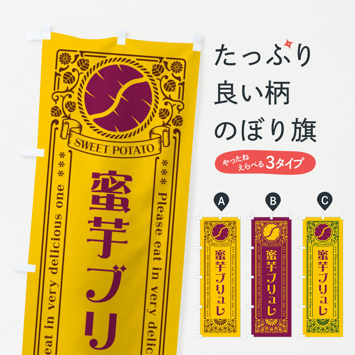 グッズプロののぼり旗は「節約じょうずのぼり」から「セレブのぼり」まで細かく調整できちゃいます。のぼり旗にひと味加えて特別仕様に一部を変えたい店名、社名を入れたいもっと大きくしたい丈夫にしたい長持ちさせたい防炎加工両面別柄にしたい飾り方も選べます壁に吊るしたい全面柄で目立ちたい紐で吊りたいピンと張りたいチチ色を変えたいちょっとおしゃれに看板のようにしたいプリンのぼり旗、他にもあります。【ネコポス送料360】 のぼり旗 蜜芋プリン・さつまいも・昔風・レトロ風のぼり GXG2 内容・記載の文字蜜芋プリン・さつまいも・昔風・レトロ風印刷自社生産 フルカラーダイレクト印刷またはシルク印刷デザイン【A】【B】【C】からお選びください。※モニターの発色によって実際のものと色が異なる場合があります。名入れ、デザイン変更(セミオーダー)などのデザイン変更が気楽にできます。以下から別途お求めください。サイズサイズの詳細については上の説明画像を御覧ください。ジャンボにしたいのぼり重量約80g素材のぼり生地:ポンジ(テトロンポンジ)一般的なのぼり旗の生地通常の薄いのぼり生地より裏抜けが減りますがとてもファンが多い良い生地です。おすすめA1ポスター:光沢紙(コート紙)チチチチとはのぼり旗にポールを通す輪っかのことです。のぼり旗が裏返ってしまうことが多い場合は右チチを試してみてください。季節により風向きが変わる場合もあります。チチの色変え※吊り下げ旗をご希望の場合はチチ無しを選択してください対応のぼりポール一般的なポールで使用できます。ポールサイズ例:最大全長3m、直径2.2cmまたは2.5cm※ポールは別売りです ポール3mのぼり包装1枚ずつ個別包装 PE袋(ポリエチレン)包装時サイズ:約20x25cm横幕に変更横幕の画像確認をご希望の場合は、決済時の備考欄に デザイン確認希望 とお書き下さい。※横幕をご希望でチチの選択がない場合は上のみのチチとなります。ご注意下さい。のぼり補強縫製見た目の美しい四辺ヒートカット仕様。ハトメ加工をご希望の場合はこちらから別途必要枚数分お求め下さい。三辺補強縫製 四辺補強縫製 棒袋縫い加工のぼり防炎加工特殊な加工のため制作にプラス2日ほどいただきます。防炎にしたい・商標権により保護されている単語ののぼり旗は、使用者が該当の商標の使用を認められている場合に限り設置できます。・設置により誤解が生じる可能性のある場合は使用できません。(使用不可な例 : AEDがないのにAEDのぼりを設置)・裏からもくっきり見せるため、風にはためくために開発された、とても薄い生地で出来ています。・屋外の使用は色あせや裁断面のほつれなどの寿命は3ヶ月〜6ヶ月です。※使用状況により異なり、屋内なら何年も持ったりします。・雨風が強い日に表に出すと寿命が縮まります。・濡れても大丈夫ですが、中途半端に濡れた状態でしまうと濡れた場所と乾いている場所に色ムラが出来る場合があります。・濡れた状態で壁などに長時間触れていると色移りをすることがあります。・通行人の目がなれる頃(3ヶ月程度)で違う色やデザインに替えるなどのローテーションをすると効果的です。・特別な事情がない限り夜間は店内にしまうなどの対応が望ましいです。・洗濯やアイロン可能ですが、扱い方により寿命に影響が出る場合があります。※オススメはしません自己責任でお願いいたします。色落ち、色移りにご注意ください。商品コード : GXG2問い合わせ時にグッズプロ楽天市場店であることと、商品コードをお伝え頂きますとスムーズです。改造・加工など、決済備考欄で商品を指定する場合は上の商品コードをお書きください。ABC【ネコポス送料360】 のぼり旗 蜜芋プリン・さつまいも・昔風・レトロ風のぼり GXG2 安心ののぼり旗ブランド 「グッズプロ」が制作する、おしゃれですばらしい発色ののぼり旗。デザインを3色展開することで、カラフルに揃えたり、2色を交互にポンポンと並べて楽しさを演出できます。文字を変えたり、名入れをしたりすることで、既製品とは一味違う特別なのぼり旗にできます。 裏面の発色にもこだわった美しいのぼり旗です。のぼり旗にとって裏抜け(裏側に印刷内容が透ける)はとても重要なポイント。通常のぼり旗は表面のみの印刷のため、風で向きが変わったときや、お客様との位置関係によっては裏面になってしまう場合があります。そこで、当店ののぼり旗は表裏の見え方に差が出ないように裏抜けにこだわりました。裏抜けの美しいのグッズプロののぼり旗は裏面になってもデザインが透けて文字や写真がバッチリ見えます。裏抜けが悪いと裏面が白っぽく、色あせて見えてしまいズボラな印象に。また視認性が悪く文字が読み取りにくいなどマイナスイメージに繋がります。いろんなところで使ってほしいから、追加料金は必要ありません。裏抜けの美しいグッズプロののぼり旗でも、風でいつも裏返しでは台無しです。チチの位置