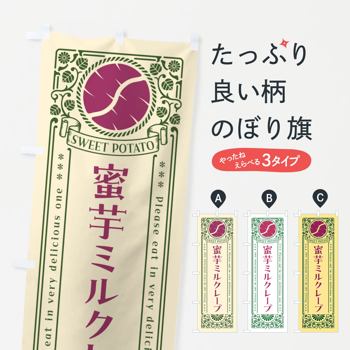 グッズプロののぼり旗は「節約じょうずのぼり」から「セレブのぼり」まで細かく調整できちゃいます。のぼり旗にひと味加えて特別仕様に一部を変えたい店名、社名を入れたいもっと大きくしたい丈夫にしたい長持ちさせたい防炎加工両面別柄にしたい飾り方も選べます壁に吊るしたい全面柄で目立ちたい紐で吊りたいピンと張りたいチチ色を変えたいちょっとおしゃれに看板のようにしたいクレープのぼり旗、他にもあります。【ネコポス送料360】 のぼり旗 蜜芋ミルクレープ・さつまいも・昔風・レトロ風のぼり GXG5 内容・記載の文字蜜芋ミルクレープ・さつまいも・昔風・レトロ風印刷自社生産 フルカラーダイレクト印刷またはシルク印刷デザイン【A】【B】【C】からお選びください。※モニターの発色によって実際のものと色が異なる場合があります。名入れ、デザイン変更(セミオーダー)などのデザイン変更が気楽にできます。以下から別途お求めください。サイズサイズの詳細については上の説明画像を御覧ください。ジャンボにしたいのぼり重量約80g素材のぼり生地:ポンジ(テトロンポンジ)一般的なのぼり旗の生地通常の薄いのぼり生地より裏抜けが減りますがとてもファンが多い良い生地です。おすすめA1ポスター:光沢紙(コート紙)チチチチとはのぼり旗にポールを通す輪っかのことです。のぼり旗が裏返ってしまうことが多い場合は右チチを試してみてください。季節により風向きが変わる場合もあります。チチの色変え※吊り下げ旗をご希望の場合はチチ無しを選択してください対応のぼりポール一般的なポールで使用できます。ポールサイズ例:最大全長3m、直径2.2cmまたは2.5cm※ポールは別売りです ポール3mのぼり包装1枚ずつ個別包装 PE袋(ポリエチレン)包装時サイズ:約20x25cm横幕に変更横幕の画像確認をご希望の場合は、決済時の備考欄に デザイン確認希望 とお書き下さい。※横幕をご希望でチチの選択がない場合は上のみのチチとなります。ご注意下さい。のぼり補強縫製見た目の美しい四辺ヒートカット仕様。ハトメ加工をご希望の場合はこちらから別途必要枚数分お求め下さい。三辺補強縫製 四辺補強縫製 棒袋縫い加工のぼり防炎加工特殊な加工のため制作にプラス2日ほどいただきます。防炎にしたい・商標権により保護されている単語ののぼり旗は、使用者が該当の商標の使用を認められている場合に限り設置できます。・設置により誤解が生じる可能性のある場合は使用できません。(使用不可な例 : AEDがないのにAEDのぼりを設置)・裏からもくっきり見せるため、風にはためくために開発された、とても薄い生地で出来ています。・屋外の使用は色あせや裁断面のほつれなどの寿命は3ヶ月〜6ヶ月です。※使用状況により異なり、屋内なら何年も持ったりします。・雨風が強い日に表に出すと寿命が縮まります。・濡れても大丈夫ですが、中途半端に濡れた状態でしまうと濡れた場所と乾いている場所に色ムラが出来る場合があります。・濡れた状態で壁などに長時間触れていると色移りをすることがあります。・通行人の目がなれる頃(3ヶ月程度)で違う色やデザインに替えるなどのローテーションをすると効果的です。・特別な事情がない限り夜間は店内にしまうなどの対応が望ましいです。・洗濯やアイロン可能ですが、扱い方により寿命に影響が出る場合があります。※オススメはしません自己責任でお願いいたします。色落ち、色移りにご注意ください。商品コード : GXG5問い合わせ時にグッズプロ楽天市場店であることと、商品コードをお伝え頂きますとスムーズです。改造・加工など、決済備考欄で商品を指定する場合は上の商品コードをお書きください。ABC【ネコポス送料360】 のぼり旗 蜜芋ミルクレープ・さつまいも・昔風・レトロ風のぼり GXG5 安心ののぼり旗ブランド 「グッズプロ」が制作する、おしゃれですばらしい発色ののぼり旗。デザインを3色展開することで、カラフルに揃えたり、2色を交互にポンポンと並べて楽しさを演出できます。文字を変えたり、名入れをしたりすることで、既製品とは一味違う特別なのぼり旗にできます。 裏面の発色にもこだわった美しいのぼり旗です。のぼり旗にとって裏抜け(裏側に印刷内容が透ける)はとても重要なポイント。通常のぼり旗は表面のみの印刷のため、風で向きが変わったときや、お客様との位置関係によっては裏面になってしまう場合があります。そこで、当店ののぼり旗は表裏の見え方に差が出ないように裏抜けにこだわりました。裏抜けの美しいのグッズプロののぼり旗は裏面になってもデザインが透けて文字や写真がバッチリ見えます。裏抜けが悪いと裏面が白っぽく、色あせて見えてしまいズボラな印象に。また視認性が悪く文字が読み取りにくいなどマイナスイメージに繋がります。いろんなところで使ってほしいから、追加料金は必要ありません。裏抜けの美しいグッズプロののぼり旗でも、風でいつも裏返しでは台