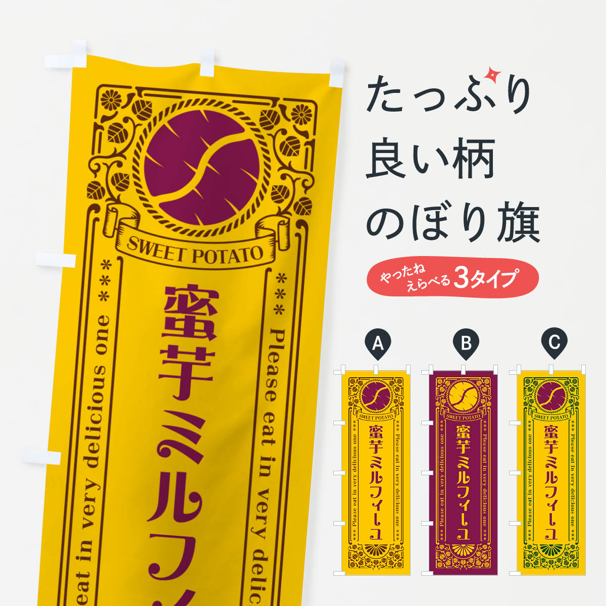 グッズプロののぼり旗は「節約じょうずのぼり」から「セレブのぼり」まで細かく調整できちゃいます。のぼり旗にひと味加えて特別仕様に一部を変えたい店名、社名を入れたいもっと大きくしたい丈夫にしたい長持ちさせたい防炎加工両面別柄にしたい飾り方も選べます壁に吊るしたい全面柄で目立ちたい紐で吊りたいピンと張りたいチチ色を変えたいちょっとおしゃれに看板のようにしたいケーキのぼり旗、他にもあります。【ネコポス送料360】 のぼり旗 蜜芋ミルフィーユ・さつまいも・昔風・レトロ風のぼり GXG6 ケーキ内容・記載の文字蜜芋ミルフィーユ・さつまいも・昔風・レトロ風印刷自社生産 フルカラーダイレクト印刷またはシルク印刷デザイン【A】【B】【C】からお選びください。※モニターの発色によって実際のものと色が異なる場合があります。名入れ、デザイン変更(セミオーダー)などのデザイン変更が気楽にできます。以下から別途お求めください。サイズサイズの詳細については上の説明画像を御覧ください。ジャンボにしたいのぼり重量約80g素材のぼり生地:ポンジ(テトロンポンジ)一般的なのぼり旗の生地通常の薄いのぼり生地より裏抜けが減りますがとてもファンが多い良い生地です。おすすめA1ポスター:光沢紙(コート紙)チチチチとはのぼり旗にポールを通す輪っかのことです。のぼり旗が裏返ってしまうことが多い場合は右チチを試してみてください。季節により風向きが変わる場合もあります。チチの色変え※吊り下げ旗をご希望の場合はチチ無しを選択してください対応のぼりポール一般的なポールで使用できます。ポールサイズ例:最大全長3m、直径2.2cmまたは2.5cm※ポールは別売りです ポール3mのぼり包装1枚ずつ個別包装 PE袋(ポリエチレン)包装時サイズ:約20x25cm横幕に変更横幕の画像確認をご希望の場合は、決済時の備考欄に デザイン確認希望 とお書き下さい。※横幕をご希望でチチの選択がない場合は上のみのチチとなります。ご注意下さい。のぼり補強縫製見た目の美しい四辺ヒートカット仕様。ハトメ加工をご希望の場合はこちらから別途必要枚数分お求め下さい。三辺補強縫製 四辺補強縫製 棒袋縫い加工のぼり防炎加工特殊な加工のため制作にプラス2日ほどいただきます。防炎にしたい・商標権により保護されている単語ののぼり旗は、使用者が該当の商標の使用を認められている場合に限り設置できます。・設置により誤解が生じる可能性のある場合は使用できません。(使用不可な例 : AEDがないのにAEDのぼりを設置)・裏からもくっきり見せるため、風にはためくために開発された、とても薄い生地で出来ています。・屋外の使用は色あせや裁断面のほつれなどの寿命は3ヶ月〜6ヶ月です。※使用状況により異なり、屋内なら何年も持ったりします。・雨風が強い日に表に出すと寿命が縮まります。・濡れても大丈夫ですが、中途半端に濡れた状態でしまうと濡れた場所と乾いている場所に色ムラが出来る場合があります。・濡れた状態で壁などに長時間触れていると色移りをすることがあります。・通行人の目がなれる頃(3ヶ月程度)で違う色やデザインに替えるなどのローテーションをすると効果的です。・特別な事情がない限り夜間は店内にしまうなどの対応が望ましいです。・洗濯やアイロン可能ですが、扱い方により寿命に影響が出る場合があります。※オススメはしません自己責任でお願いいたします。色落ち、色移りにご注意ください。商品コード : GXG6問い合わせ時にグッズプロ楽天市場店であることと、商品コードをお伝え頂きますとスムーズです。改造・加工など、決済備考欄で商品を指定する場合は上の商品コードをお書きください。ABC【ネコポス送料360】 のぼり旗 蜜芋ミルフィーユ・さつまいも・昔風・レトロ風のぼり GXG6 ケーキ 安心ののぼり旗ブランド 「グッズプロ」が制作する、おしゃれですばらしい発色ののぼり旗。デザインを3色展開することで、カラフルに揃えたり、2色を交互にポンポンと並べて楽しさを演出できます。文字を変えたり、名入れをしたりすることで、既製品とは一味違う特別なのぼり旗にできます。 裏面の発色にもこだわった美しいのぼり旗です。のぼり旗にとって裏抜け(裏側に印刷内容が透ける)はとても重要なポイント。通常のぼり旗は表面のみの印刷のため、風で向きが変わったときや、お客様との位置関係によっては裏面になってしまう場合があります。そこで、当店ののぼり旗は表裏の見え方に差が出ないように裏抜けにこだわりました。裏抜けの美しいのグッズプロののぼり旗は裏面になってもデザインが透けて文字や写真がバッチリ見えます。裏抜けが悪いと裏面が白っぽく、色あせて見えてしまいズボラな印象に。また視認性が悪く文字が読み取りにくいなどマイナスイメージに繋がります。いろんなところで使ってほしいから、追加料金は必要ありません。裏抜けの美しいグッズプロののぼり旗でも、風でいつも裏