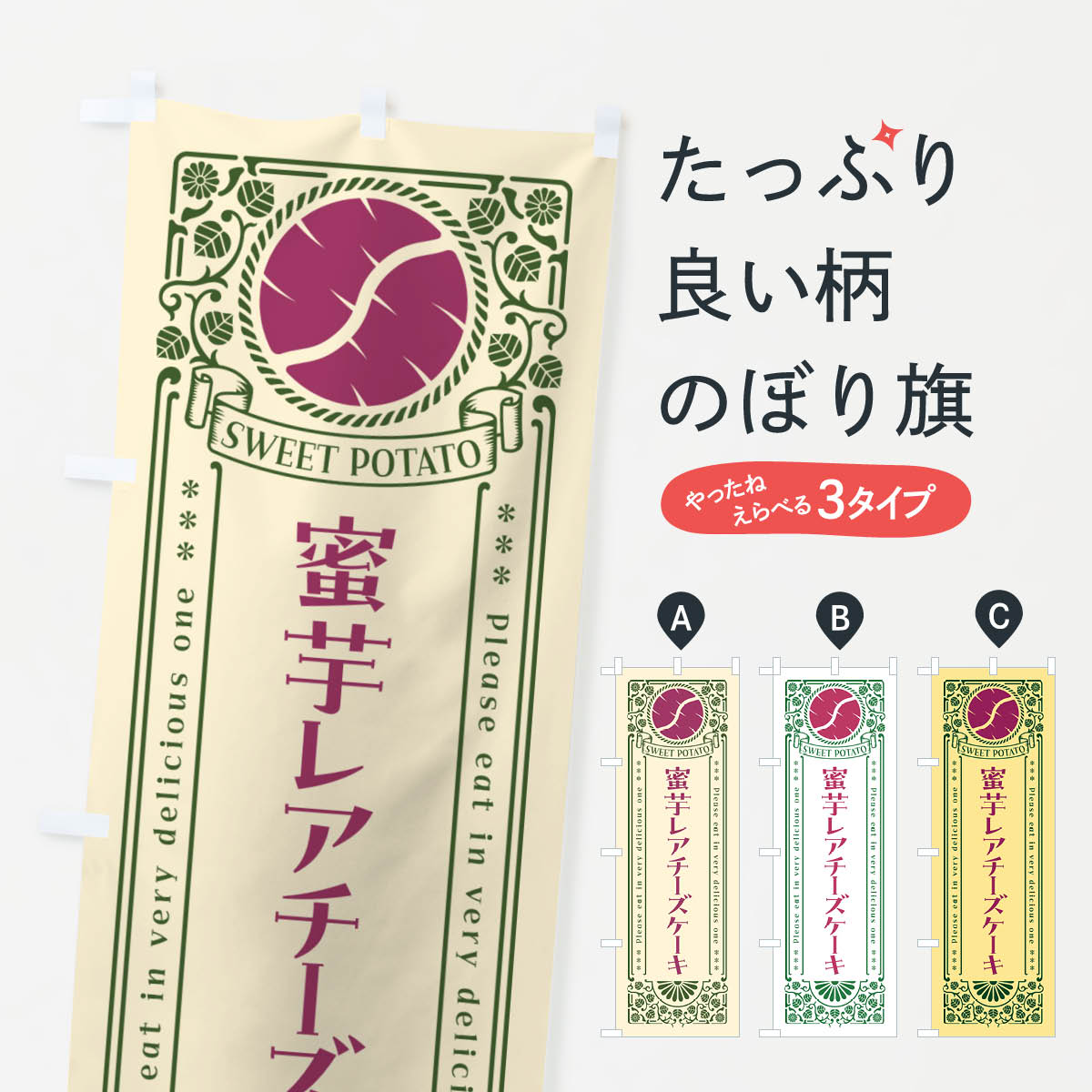 グッズプロののぼり旗は「節約じょうずのぼり」から「セレブのぼり」まで細かく調整できちゃいます。のぼり旗にひと味加えて特別仕様に一部を変えたい店名、社名を入れたいもっと大きくしたい丈夫にしたい長持ちさせたい防炎加工両面別柄にしたい飾り方も選べます壁に吊るしたい全面柄で目立ちたい紐で吊りたいピンと張りたいチチ色を変えたいちょっとおしゃれに看板のようにしたいケーキのぼり旗、他にもあります。【ネコポス送料360】 のぼり旗 蜜芋レアチーズケーキ・さつまいも・昔風・レトロ風のぼり GXG8 内容・記載の文字蜜芋レアチーズケーキ・さつまいも・昔風・レトロ風印刷自社生産 フルカラーダイレクト印刷またはシルク印刷デザイン【A】【B】【C】からお選びください。※モニターの発色によって実際のものと色が異なる場合があります。名入れ、デザイン変更(セミオーダー)などのデザイン変更が気楽にできます。以下から別途お求めください。サイズサイズの詳細については上の説明画像を御覧ください。ジャンボにしたいのぼり重量約80g素材のぼり生地:ポンジ(テトロンポンジ)一般的なのぼり旗の生地通常の薄いのぼり生地より裏抜けが減りますがとてもファンが多い良い生地です。おすすめA1ポスター:光沢紙(コート紙)チチチチとはのぼり旗にポールを通す輪っかのことです。のぼり旗が裏返ってしまうことが多い場合は右チチを試してみてください。季節により風向きが変わる場合もあります。チチの色変え※吊り下げ旗をご希望の場合はチチ無しを選択してください対応のぼりポール一般的なポールで使用できます。ポールサイズ例:最大全長3m、直径2.2cmまたは2.5cm※ポールは別売りです ポール3mのぼり包装1枚ずつ個別包装 PE袋(ポリエチレン)包装時サイズ:約20x25cm横幕に変更横幕の画像確認をご希望の場合は、決済時の備考欄に デザイン確認希望 とお書き下さい。※横幕をご希望でチチの選択がない場合は上のみのチチとなります。ご注意下さい。のぼり補強縫製見た目の美しい四辺ヒートカット仕様。ハトメ加工をご希望の場合はこちらから別途必要枚数分お求め下さい。三辺補強縫製 四辺補強縫製 棒袋縫い加工のぼり防炎加工特殊な加工のため制作にプラス2日ほどいただきます。防炎にしたい・商標権により保護されている単語ののぼり旗は、使用者が該当の商標の使用を認められている場合に限り設置できます。・設置により誤解が生じる可能性のある場合は使用できません。(使用不可な例 : AEDがないのにAEDのぼりを設置)・裏からもくっきり見せるため、風にはためくために開発された、とても薄い生地で出来ています。・屋外の使用は色あせや裁断面のほつれなどの寿命は3ヶ月〜6ヶ月です。※使用状況により異なり、屋内なら何年も持ったりします。・雨風が強い日に表に出すと寿命が縮まります。・濡れても大丈夫ですが、中途半端に濡れた状態でしまうと濡れた場所と乾いている場所に色ムラが出来る場合があります。・濡れた状態で壁などに長時間触れていると色移りをすることがあります。・通行人の目がなれる頃(3ヶ月程度)で違う色やデザインに替えるなどのローテーションをすると効果的です。・特別な事情がない限り夜間は店内にしまうなどの対応が望ましいです。・洗濯やアイロン可能ですが、扱い方により寿命に影響が出る場合があります。※オススメはしません自己責任でお願いいたします。色落ち、色移りにご注意ください。商品コード : GXG8問い合わせ時にグッズプロ楽天市場店であることと、商品コードをお伝え頂きますとスムーズです。改造・加工など、決済備考欄で商品を指定する場合は上の商品コードをお書きください。ABC【ネコポス送料360】 のぼり旗 蜜芋レアチーズケーキ・さつまいも・昔風・レトロ風のぼり GXG8 安心ののぼり旗ブランド 「グッズプロ」が制作する、おしゃれですばらしい発色ののぼり旗。デザインを3色展開することで、カラフルに揃えたり、2色を交互にポンポンと並べて楽しさを演出できます。文字を変えたり、名入れをしたりすることで、既製品とは一味違う特別なのぼり旗にできます。 裏面の発色にもこだわった美しいのぼり旗です。のぼり旗にとって裏抜け(裏側に印刷内容が透ける)はとても重要なポイント。通常のぼり旗は表面のみの印刷のため、風で向きが変わったときや、お客様との位置関係によっては裏面になってしまう場合があります。そこで、当店ののぼり旗は表裏の見え方に差が出ないように裏抜けにこだわりました。裏抜けの美しいのグッズプロののぼり旗は裏面になってもデザインが透けて文字や写真がバッチリ見えます。裏抜けが悪いと裏面が白っぽく、色あせて見えてしまいズボラな印象に。また視認性が悪く文字が読み取りにくいなどマイナスイメージに繋がります。いろんなところで使ってほしいから、追加料金は必要ありません。裏抜けの美しいグッズプロののぼり旗でも、風でいつも裏