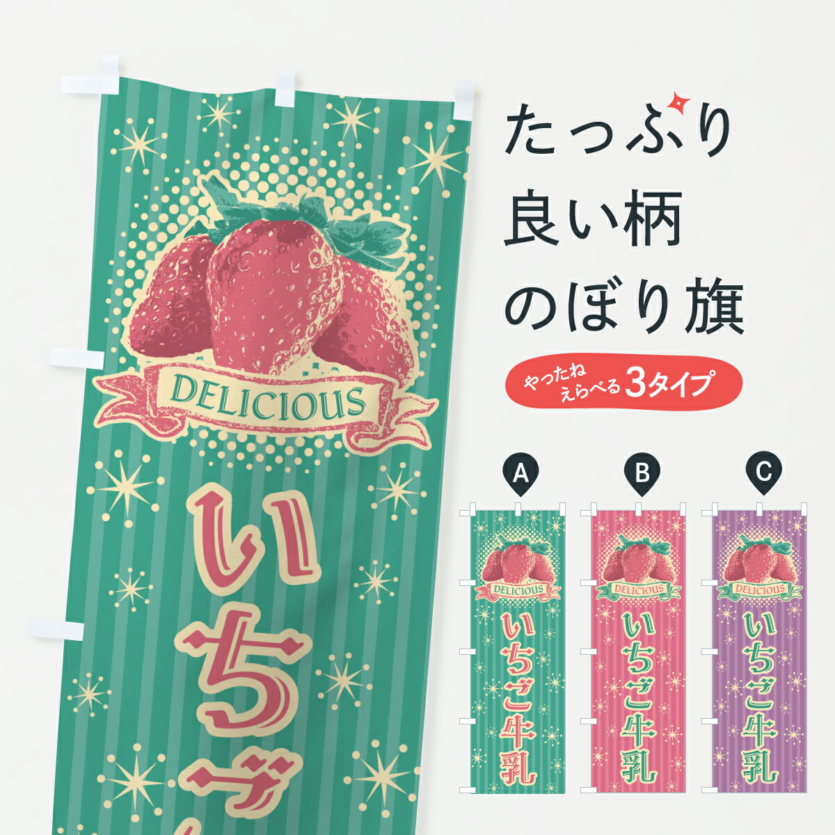 グッズプロののぼり旗は「節約じょうずのぼり」から「セレブのぼり」まで細かく調整できちゃいます。のぼり旗にひと味加えて特別仕様に一部を変えたい店名、社名を入れたいもっと大きくしたい丈夫にしたい長持ちさせたい防炎加工両面別柄にしたい飾り方も選べます壁に吊るしたい全面柄で目立ちたい紐で吊りたいピンと張りたいチチ色を変えたいちょっとおしゃれに看板のようにしたい牛乳・乳製品のぼり旗、他にもあります。【ポスト便 送料360】 のぼり旗 いちご牛乳のぼり 6GXG 牛乳・乳製品 グッズプロ内容・記載の文字いちご牛乳印刷自社生産 フルカラーダイレクト印刷またはシルク印刷デザイン【A】【B】【C】からお選びください。※モニターの発色によって実際のものと色が異なる場合があります。名入れ、デザイン変更(セミオーダー)などのデザイン変更が気楽にできます。以下から別途お求めください。サイズサイズの詳細については上の説明画像を御覧ください。ジャンボにしたいのぼり重量約80g素材のぼり生地:ポンジ(テトロンポンジ)一般的なのぼり旗の生地通常の薄いのぼり生地より裏抜けが減りますがとてもファンが多い良い生地です。おすすめA1ポスター:光沢紙(コート紙)チチチチとはのぼり旗にポールを通す輪っかのことです。のぼり旗が裏返ってしまうことが多い場合は右チチを試してみてください。季節により風向きが変わる場合もあります。チチの色変え※吊り下げ旗をご希望の場合はチチ無しを選択してください対応のぼりポール一般的なポールで使用できます。ポールサイズ例:最大全長3m、直径2.2cmまたは2.5cm※ポールは別売りです ポール3mのぼり包装1枚ずつ個別包装 PE袋(ポリエチレン)包装時サイズ:約20x25cm横幕に変更横幕の画像確認をご希望の場合は、決済時の備考欄に デザイン確認希望 とお書き下さい。※横幕をご希望でチチの選択がない場合は上のみのチチとなります。ご注意下さい。のぼり補強縫製見た目の美しい四辺ヒートカット仕様。ハトメ加工をご希望の場合はこちらから別途必要枚数分お求め下さい。三辺補強縫製 四辺補強縫製 棒袋縫い加工のぼり防炎加工特殊な加工のため制作にプラス2日ほどいただきます。防炎にしたい・商標権により保護されている単語ののぼり旗は、使用者が該当の商標の使用を認められている場合に限り設置できます。・設置により誤解が生じる可能性のある場合は使用できません。(使用不可な例 : AEDがないのにAEDのぼりを設置)・裏からもくっきり見せるため、風にはためくために開発された、とても薄い生地で出来ています。・屋外の使用は色あせや裁断面のほつれなどの寿命は3ヶ月・・6ヶ月です。※使用状況により異なり、屋内なら何年も持ったりします。・雨風が強い日に表に出すと寿命が縮まります。・濡れても大丈夫ですが、中途半端に濡れた状態でしまうと濡れた場所と乾いている場所に色ムラが出来る場合があります。・濡れた状態で壁などに長時間触れていると色移りをすることがあります。・通行人の目がなれる頃(3ヶ月程度)で違う色やデザインに替えるなどのローテーションをすると効果的です。・特別な事情がない限り夜間は店内にしまうなどの対応が望ましいです。・洗濯やアイロン可能ですが、扱い方により寿命に影響が出る場合があります。※オススメはしません自己責任でお願いいたします。色落ち、色移りにご注意ください。商品コード : 6GXG問い合わせ時にグッズプロ楽天市場店であることと、商品コードをお伝え頂きますとスムーズです。改造・加工など、決済備考欄で商品を指定する場合は上の商品コードをお書きください。ABC【ポスト便 送料360】 のぼり旗 いちご牛乳のぼり 6GXG 牛乳・乳製品 グッズプロ 安心ののぼり旗ブランド 「グッズプロ」が制作する、おしゃれですばらしい発色ののぼり旗。デザインを3色展開することで、カラフルに揃えたり、2色を交互にポンポンと並べて楽しさを演出できます。文字を変えたり、名入れをしたりすることで、既製品とは一味違う特別なのぼり旗にできます。 裏面の発色にもこだわった美しいのぼり旗です。のぼり旗にとって裏抜け(裏側に印刷内容が透ける)はとても重要なポイント。通常のぼり旗は表面のみの印刷のため、風で向きが変わったときや、お客様との位置関係によっては裏面になってしまう場合があります。そこで、当店ののぼり旗は表裏の見え方に差が出ないように裏抜けにこだわりました。裏抜けの美しいのグッズプロののぼり旗は裏面になってもデザインが透けて文字や写真がバッチリ見えます。裏抜けが悪いと裏面が白っぽく、色あせて見えてしまいズボラな印象に。また視認性が悪く文字が読み取りにくいなどマイナスイメージに繋がります。いろんなところで使ってほしいから、追加料金は必要ありません。裏抜けの美しいグッズプロののぼり旗でも、風でいつも裏返しでは台無しです。チチの位置を変えて風向きに沿って設置出来