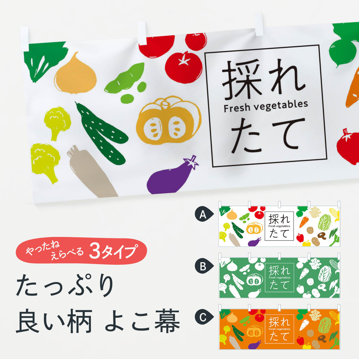 グッズプロののぼり旗は「節約じょうずのぼり」から「セレブのぼり」まで細かく調整できちゃいます。のぼり旗にひと味加えて特別仕様に一部を変えたい店名、社名を入れたいもっと大きくしたい丈夫にしたい長持ちさせたい防炎加工両面別柄にしたい飾り方も選べます壁に吊るしたい全面柄で目立ちたい紐で吊りたいピンと張りたいチチ色を変えたいちょっとおしゃれに看板のようにしたいのぼり旗、他にもあります。採れたて野菜のぼり旗内容・記載の文字印刷自社生産 フルカラーダイレクト印刷またはシルク印刷デザイン【A】【B】【C】からお選びください。※モニターの発色によって実際のものと色が異なる場合があります。名入れ、デザイン変更(セミオーダー)などのデザイン変更が気楽にできます。以下から別途お求めください。サイズサイズの詳細については上の説明画像を御覧ください。ジャンボにしたいのぼり重量約80g素材のぼり生地:ポンジ(テトロンポンジ)一般的なのぼり旗の生地通常の薄いのぼり生地より裏抜けが減りますがとてもファンが多い良い生地です。おすすめA1ポスター:光沢紙(コート紙)チチチチとはのぼり旗にポールを通す輪っかのことです。のぼり旗が裏返ってしまうことが多い場合は右チチを試してみてください。季節により風向きが変わる場合もあります。チチの色変え※吊り下げ旗をご希望の場合はチチ無しを選択してください対応のぼりポール一般的なポールで使用できます。ポールサイズ例:最大全長3m、直径2.2cmまたは2.5cm※ポールは別売りです ポール3mのぼり包装1枚ずつ個別包装 PE袋(ポリエチレン)包装時サイズ:約20x25cm横幕に変更横幕の画像確認をご希望の場合は、決済時の備考欄に デザイン確認希望 とお書き下さい。※横幕をご希望でチチの選択がない場合は上のみのチチとなります。ご注意下さい。のぼり補強縫製見た目の美しい四辺ヒートカット仕様。ハトメ加工をご希望の場合はこちらから別途必要枚数分お求め下さい。三辺補強縫製 四辺補強縫製 棒袋縫い加工のぼり防炎加工特殊な加工のため制作にプラス2日ほどいただきます。防炎にしたい・商標権により保護されている単語ののぼり旗は、使用者が該当の商標の使用を認められている場合に限り設置できます。・設置により誤解が生じる可能性のある場合は使用できません。(使用不可な例 : AEDがないのにAEDのぼりを設置)・裏からもくっきり見せるため、風にはためくために開発された、とても薄い生地で出来ています。・屋外の使用は色あせや裁断面のほつれなどの寿命は3ヶ月・・6ヶ月です。※使用状況により異なり、屋内なら何年も持ったりします。・雨風が強い日に表に出すと寿命が縮まります。・濡れても大丈夫ですが、中途半端に濡れた状態でしまうと濡れた場所と乾いている場所に色ムラが出来る場合があります。・濡れた状態で壁などに長時間触れていると色移りをすることがあります。・通行人の目がなれる頃(3ヶ月程度)で違う色やデザインに替えるなどのローテーションをすると効果的です。・特別な事情がない限り夜間は店内にしまうなどの対応が望ましいです。・洗濯やアイロン可能ですが、扱い方により寿命に影響が出る場合があります。※オススメはしません自己責任でお願いいたします。色落ち、色移りにご注意ください。商品コード : 7GXG問い合わせ時にグッズプロ楽天市場店であることと、商品コードをお伝え頂きますとスムーズです。改造・加工など、決済備考欄で商品を指定する場合は上の商品コードをお書きください。ABC採れたて野菜のぼり旗 安心ののぼり旗ブランド 「グッズプロ」が制作する、おしゃれですばらしい発色ののぼり旗。デザインを3色展開することで、カラフルに揃えたり、2色を交互にポンポンと並べて楽しさを演出できます。文字を変えたり、名入れをしたりすることで、既製品とは一味違う特別なのぼり旗にできます。 裏面の発色にもこだわった美しいのぼり旗です。のぼり旗にとって裏抜け(裏側に印刷内容が透ける)はとても重要なポイント。通常のぼり旗は表面のみの印刷のため、風で向きが変わったときや、お客様との位置関係によっては裏面になってしまう場合があります。そこで、当店ののぼり旗は表裏の見え方に差が出ないように裏抜けにこだわりました。裏抜けの美しいのグッズプロののぼり旗は裏面になってもデザインが透けて文字や写真がバッチリ見えます。裏抜けが悪いと裏面が白っぽく、色あせて見えてしまいズボラな印象に。また視認性が悪く文字が読み取りにくいなどマイナスイメージに繋がります。いろんなところで使ってほしいから、追加料金は必要ありません。裏抜けの美しいグッズプロののぼり旗でも、風でいつも裏返しでは台無しです。チチの位置を変えて風向きに沿って設置出来ます。横幕はのぼり旗と同じデザインで作ることができるので統一感もアップします。場所に合わせてサイズを変えられます。サイズの