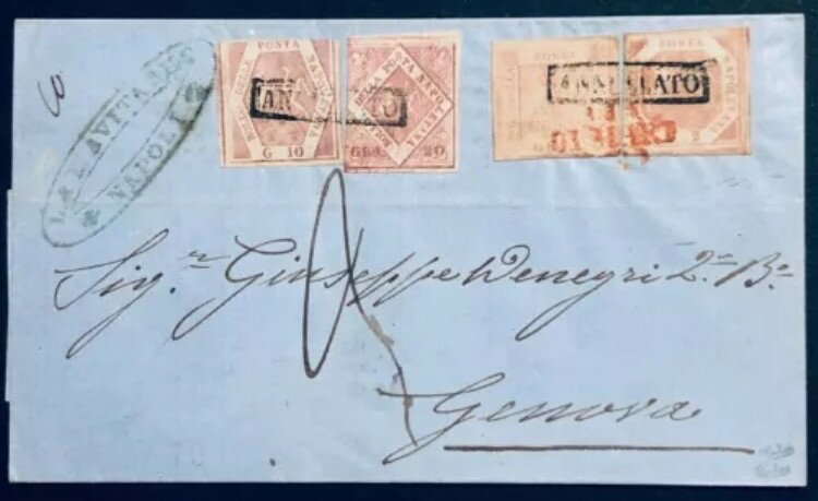 ナポリ 2+1+10+20 グラナ 1858/9/4 Via Mare Cancellatore Sardinia Taxata Genoa-