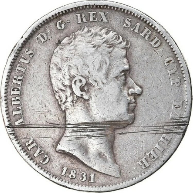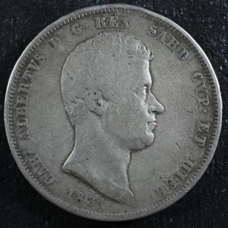 [#874754] コイン、イタリア諸州、サルデーニャ、カルロ・アルベルト、5リラ、1831年、ジェノヴァ、VF