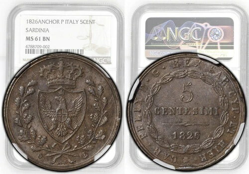 イタリア、サルデーニャ、カルロ フェリーチェ、5 Centesimi 1826、ジェノヴァ、アンカー、NGC MS 61 BN