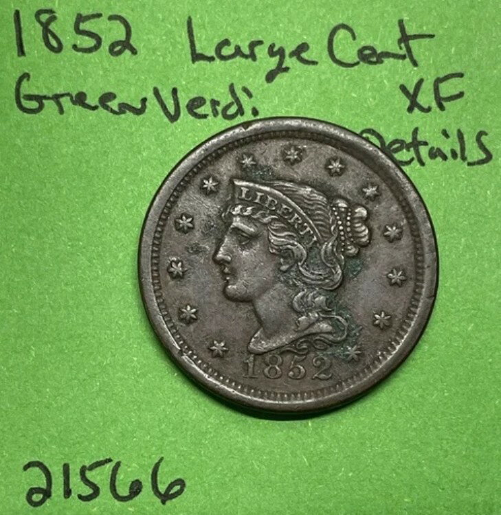 1852年 編み込みヘア ラージ セント 1c XF 極細ディテール グリーン 緑青 表面。