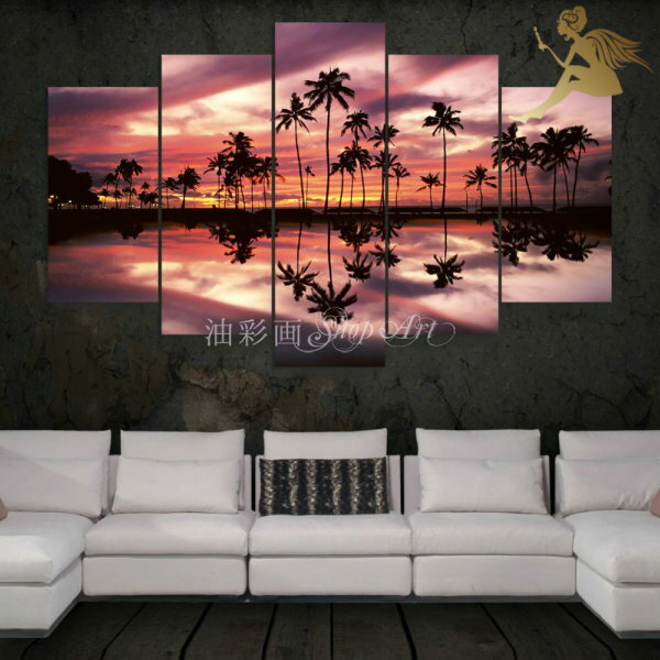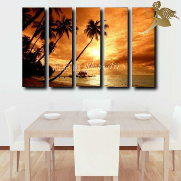 絵画 壁掛け 手書き油絵 風景画 絵アートボード 海『送料無料』/モダン インテリア アートパネル/『5パネルSET 夕焼けのココナッツビーチ 1662』リゾートアート おしゃれな壁飾り飾るだけ ハワイアン