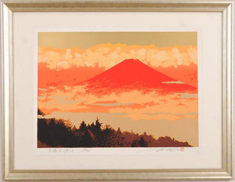 ●画家名:池上壮豊 ●作品名:赤富士-輝照 ●絵のサイズ:W54×H37cm ●額装サイズ:W80×H62cm ●版画の技法:シルクスクリーン ●サイン:作家直筆鉛筆サイン ●納期:9日 池上壮豊先生がシルクスクリーンの版画で制作した富士山の和の絵「赤富士-輝照」は、池上壮豊先生らしい威厳を感じる赤富士の和の絵です。 限定枚数は175部で、池上壮豊先生の富士山の絵としては多いほうなのですが、非常に人気があり残枚数は僅かしかありません。 赤い富士山と、まだ朝早く暗い森の色のコントラストが、とても見事な赤富士の和の絵です。 赤富士の絵は古来から吉兆とされ、大変目出度いものですが、この富士山の和の絵を見ると納得がいきます。 静寂と荘厳さを両方兼ね備えた素晴らしい富士山の和の絵だと思います。 池上壮豊 プロフィール 1940年福岡県久留米市に生まれる。 1959年武蔵野美術大学に入学する。 1960〜1963年創元会展、春陽会展、自由美術会展等に出品する。 1964年個展、二人展、グループ展等に出品する。 1965年広告、出版等、イラストレータとして独立する。 1981〜1984年 日本版画協会展に作品を出品する。 1982年期待の新人作家賞展に作品を出品する。 1985年フィナール国際美術展に作品を出品する。 1987年AJACスペイン展、東京展に作品を出品する。 1988年〜各地でシルクスクリーンの版画の新作展を開催する。 1990年〜朝日、毎日など各新聞社主催の福祉基金にシルクスクリーンの版画を賛助出品する。 1993年CWAJ現代版画展に作品を出品する。 潮文社「山頭火句集」の表紙に選ばれる。 1993〜1998年近代日本美術協会の東京展、大阪展に作品を出品する。 1996年ベルギー国際展に作品を出品する。 1997年三人展を東京有楽町で開催する。 1998年CWAJ現代版画展、モナコ国際展に作品を出品する。 1999年CWAJ現代版画展に作品を出品する。 2000年CWAJ展で技法参考作品としてシルクスクリーンの版画が紹介される。 2005年〜読売新聞社主催の福祉募金にシルクスクリーンの版画を賛助出品する。 【受 賞】 自治大臣賞、国務大臣賞、仏大使館賞、 美術家名鑑賞、国際芸術新聞社賞、その他