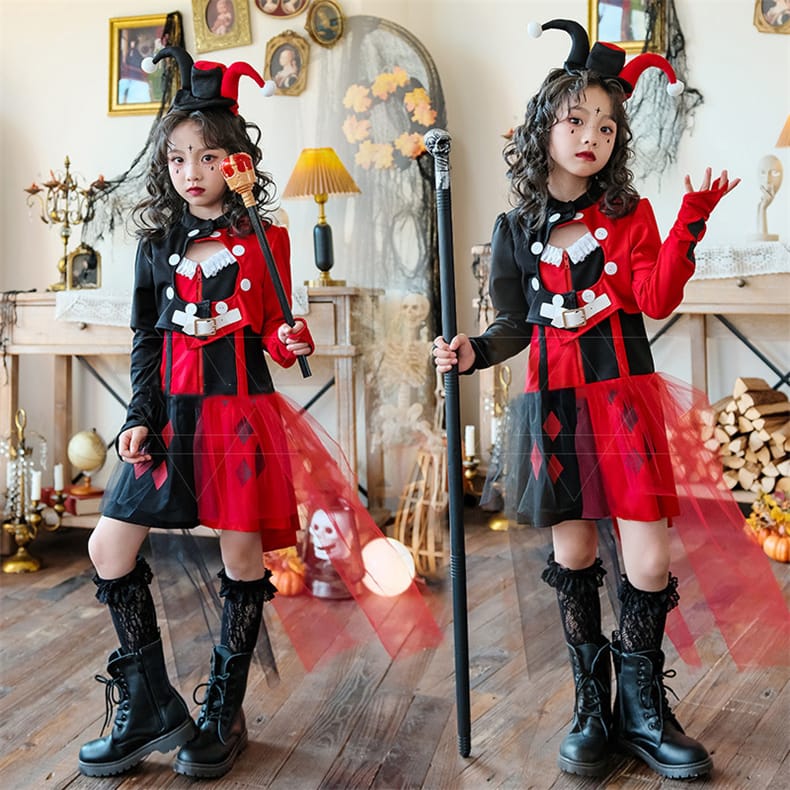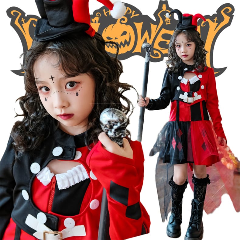 コスチューム ピエロ ハロウィン 変装 仮装 ワンピース 4点セット 赤 黒 女の子 魔女 トランプ仮装 帽子 プリンセス コスプレ キッズ 女の子 妖精 パーティー 仮装 キッズ 魔法使い 子どもドレス エルフ cosplay キッズ ワンピ 精霊 イベント