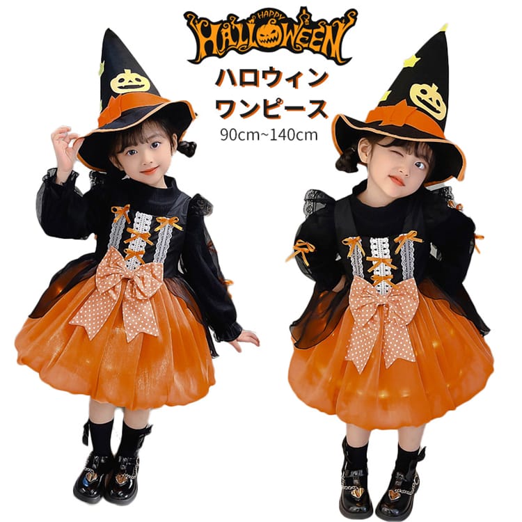 ハロウィン ベビー服 女の子 魔女 かぼちゃ コスプレ 仮装 キッズ ドレス ワンピース 子供 女の子 妖精 帽子 パニエ パーティー 仮装 キッズ 変装 魔法使い キッズ 子どもドレス 女の子 エルフ cosplay コスチューム キッズ 子供 ワンピ 90cm~140cm 送料無料