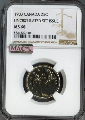 1983 Canada 25 Cents NGC MS68 MAC Quality商品について組成:ニッケル認証番号:なし打刻:ビジネス純度:0.8品位:MS 68貨幣番号:62b定規:エリザベス2世認証:NGC額面:25セント流通/非流通:非流通年:1983年製造国/地域:カナダ種類:エリザベス2世 (1952-2022)注意事項※以下の注意事項をご理解のうえ、ご購入ください■ 鑑定済みコイン・紙幣について各種コイン・紙幣の鑑定機関(NGC、PCGS、PMGなど)は、収集品の真贋鑑定およびグレーディングを行う専門機関です。鑑定後の商品は、専用ケース(スラブ)に封入され、状態を示すグレードが付与されます。■ グレードについてグレードはコイン・紙幣自体の状態を評価するものであり、ケース自体の品質や状態を保証するものではありません。製造・輸送時の影響により、以下のような状態が発生する場合がございます。- 軽微なスレ傷・拭き傷(特に光の角度で見えるもの)- ケース内部のホコリ・小さな異物(鑑定機関の検品基準を満たしている場合)- ラベルのズレ・わずかな傾きこれらは鑑定機関の基準内であり、返品・交換の対象とはなりませんのでご了承ください。■ ラベルの種類について各鑑定機関では、コイン・紙幣の状態や鑑定の結果に応じて異なるラベルが付与されます。- 通常ラベル(Standard/Regular):一般的なグレード付き鑑定済みコイン・紙幣- オーセンティック(Authentic):グレードなしで真贋のみ保証- 詳細グレード(Details):クリーニング跡やエッジのダメージがあるが本物と認定- 特別ラベル(Special Label):記念版や特定のデザインの限定ラベル - 例:NGC「Early Releases」「First Releases」、PCGS「First Strike」 などグレードやラベルの種類は、商品画像および説明文をご確認のうえ、ご購入ください。■ 在庫状況について当店の商品は海外から取り寄せております。ご購入のタイミングによっては在庫切れとなる場合がございます。その際はご連絡のうえ、ご注文をキャンセルさせていただく場合がございますので、あらかじめご了承ください。■ ご注文後のキャンセルについてご注文と同時に商品のお取り寄せを開始するため、お客様都合によるキャンセルは承っておりません。■ 配送についてお届けまでに通常2〜3週間ほどかかります。海外の祝日や天候、税関手続きにより通常より配送が遅れる可能性がございます。■ 保証について商品説明に英語で「保証(warranty)」と記載があっても、日本国内では適用されませんのでご了承ください。 当店では、商品到着後7日以内の初期不良に限り、対応させていただきます。 (返品規約の詳細については、楽天市場内の会社概要欄下部をご参照ください。)■ 商品の色・素材感について撮影環境やモニター設定により、実際の商品と色味や質感が異なる場合がございます。■ 価格変動について希少性の高い商品は市場価格の変動により、追加料金をお願いする場合がございます。追加料金に同意いただけない場合には、ご注文のキャンセルが可能ですので、ご安心ください。■ その他サービスについて海外製品の輸入代行も承っております。ショップに掲載されていない商品でもお探し可能ですので、お気軽にご相談ください。尚、業者販売(業販)や複数購入の場合、割引対応も可能です。ご希望の方はお問い合わせください。