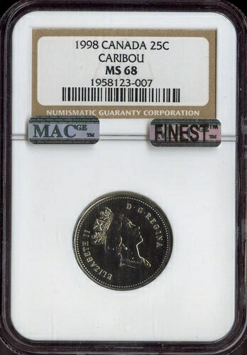 1998年カナダ25セント25セントカリブーNGC MS68 MAC品質