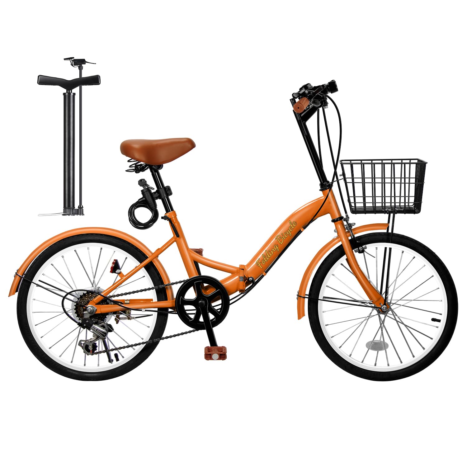 Mixiu 折畳み自転車 20インチ 軽量 素早く折畳可能 シマノ6段変速 高炭素鋼フレーム ハンドル・サドル高さ調整可能 折り畳み自転車 通勤 通学 折りたたみ自転車 前後泥除け装備 ワイヤーロック、ライト、カゴ、空気入れ付き 男女兼用 (オレンジ)